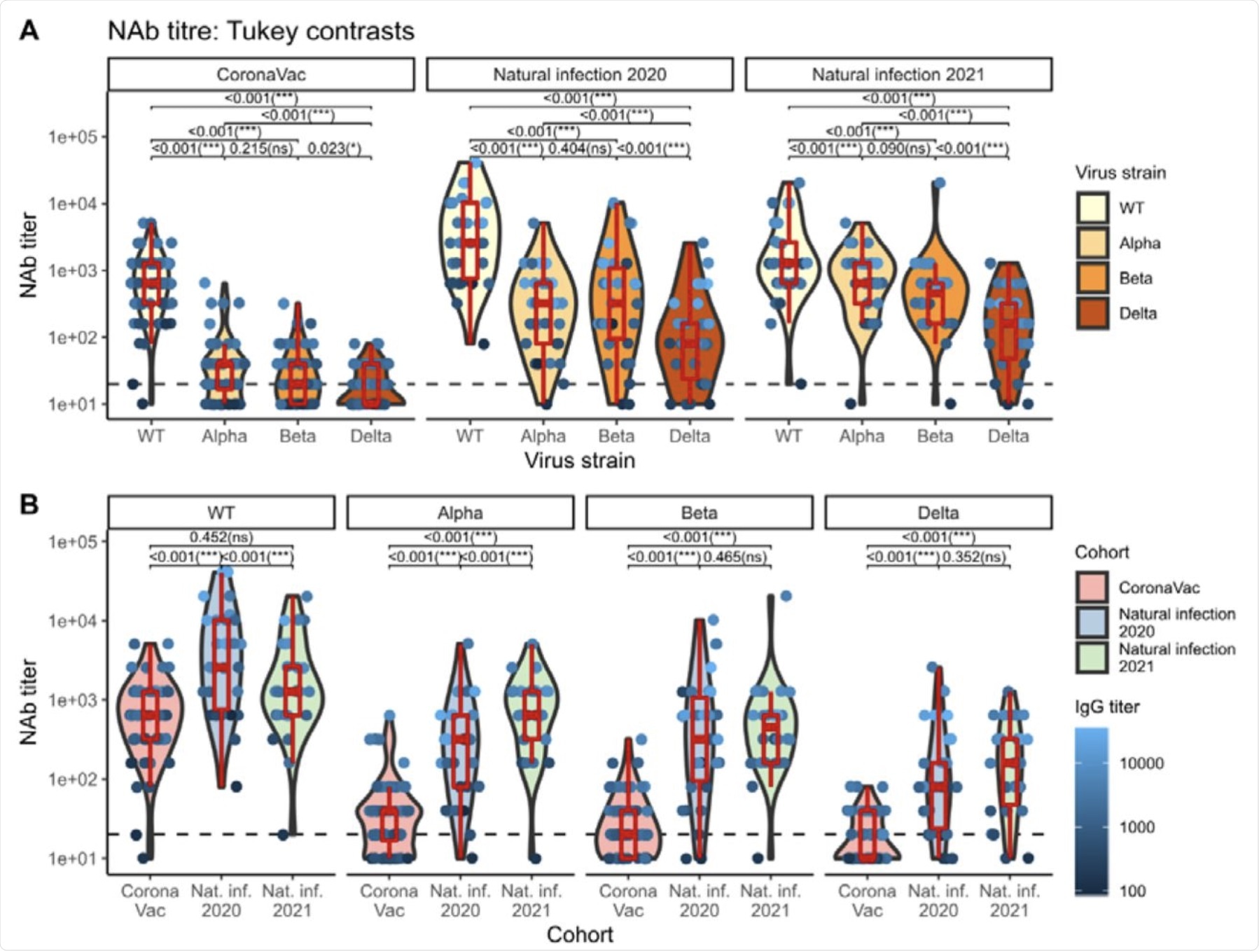 In this study, the researchers assessed S1-receptor-binding domain (RBD)-binding immunoglobulin G (IgG) levels, and neutralizing antibody (NAb) titers against the SARS-CoV-2 prototypic vaccine strain (WT), as well as the Alpha, Beta, and Delta SARS-CoV-2 variants. The efficacy of the CoronaVac was assessed using the sera from healthcare workers who were fully vaccinated with the CoronaVac vaccine.