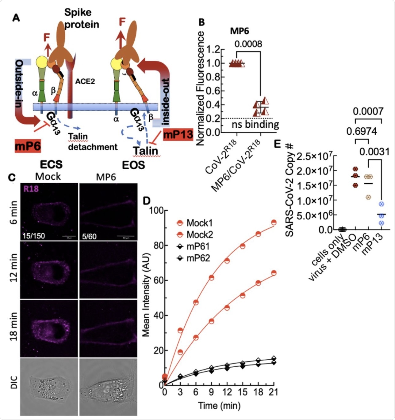 A. Model of outsideinside-out signaling for integrin-mediated cell entry. Hypothetical SARS-CoV-2 binding to integrin β1 initiates Gα13 binding to the β1 cytoplasmic tail, which stimulates outside-in signaling in the absence of a known receptor-stimulated GPCR mediated inside-out signaling. mP6 is a specific inhibitor of Gα13 binding to the β1 cytoplasmic tail. B. Relative fluorescence readings of suspension Vero E6 cells after 30 min incubation with SARS-CoV-2R18 in vehicle and 100 μM mP6 treated cells. C. Live cell imaging of SARS-CoV-2R18 (magenta) binding and endocytosis shows cell membrane and perinuclear localization of SARS-CoV-2R18 vesicles while virus is seen to remain at the plasma membrane in cells treated with 50 μM mP6. LUT ranges shown in the bottom left corner of 6-min timepoint images. Scale bars, 10 μm. D. Traces of absolute intensity values of virus binding over time. Two representative cells for each condition are plotted from data acquired on the same day to enable direct comparison of intensity values. For comparison, mock-treated cell data are the same as in Figure 4. Data were fit to a non-linear regression function with arbitrary constants for appearance purposes. E. Inhibition of SARS-CoV-2 productive infection. Suspension Vero E6 cells were preincubated with 250 μM mP6 and 250 μM mP13 for 30 min and followed by infection with 0.01 MOI SARS-COV-2 for an additional 60 min incubation. Cells were washed twice and transferred to a 12 well plate for 48 hours and assayed for viral RNA by RT-qPCR.