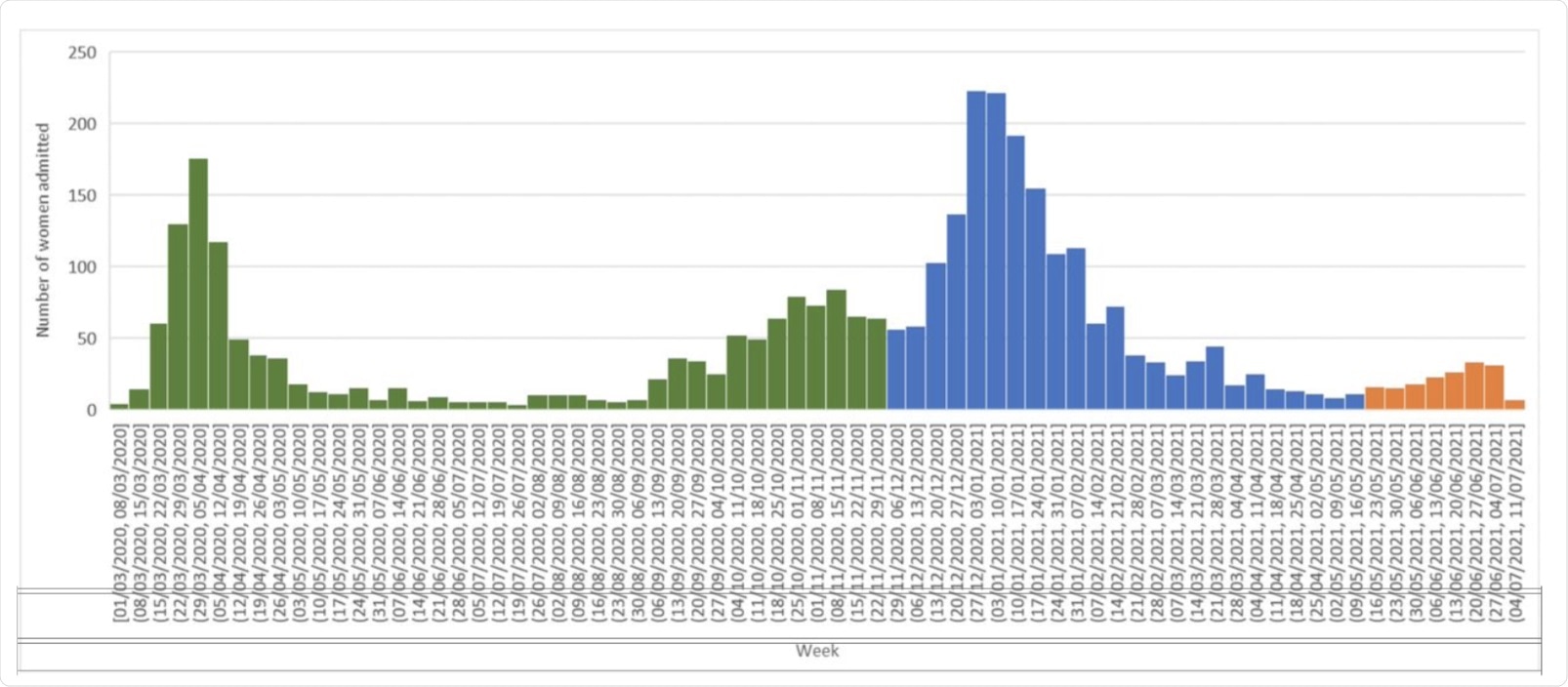Admissions of pregnant women with symptomatic confirmed SARS-CoV-2 to UK hospitals during Wildtype (01/03/20-30/11/2 2020, Green), Alpha (01/12/20 – 15/05/21, Blue) and Delta periods (16/05/21-11/07/21, Orange)
