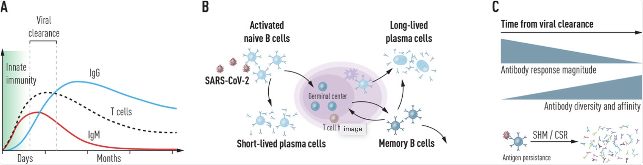 (a) Kinetics of innate and adaptive immune responses following SARS-CoV-2 infection. Following rapid action by the innate immune system immediately after virus exposure, B and T cell responses develop within the first weeks. Short-lived IgM antibodies are produced by responding B cells initially and is followed by a more persistent and high-affinity class-switched response. (b) Production of highly diverse virus-specific antibodies. After cognate antigen encounter, activated naïve B cells enter the germinal center (GC) where they receive T cell help to generate a high-affinity antibody repertoire. Short-lived peripheral plasma cells produce most antibodies during the infection, while GC-derived memory B cells and bone marrow-resident plasma cells cooperate to provide long-lasting protection against re-infection. (c) Maturation of the antibody response following viral clearance. While the magnitude of the antibody response gradually wanes after the virus replication is controlled, the quality of the B cell response continues to improve for several months following the infection.