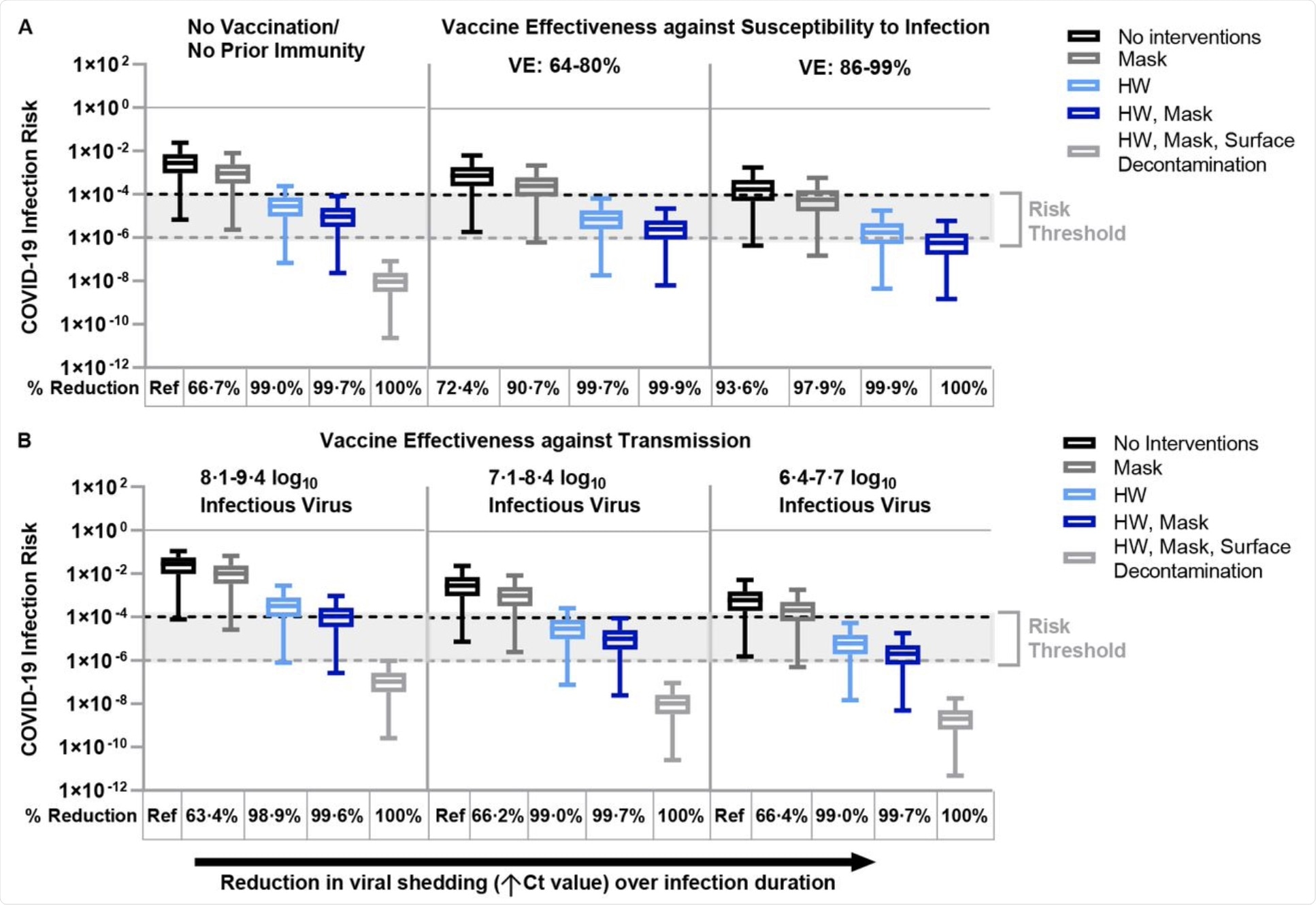 Vaccination with two doses of a messenger RNA (mRNA) vaccine reduced the risk of infection by up to 96% under optimal conditions or at least 72% with reduced vaccine efficacy. If mask-wearing, hourly handwashing, or both were adopted, the risk was reduced by 91%, 99.7%, and 99.9%, respectively, when compared to the unvaccinated state.