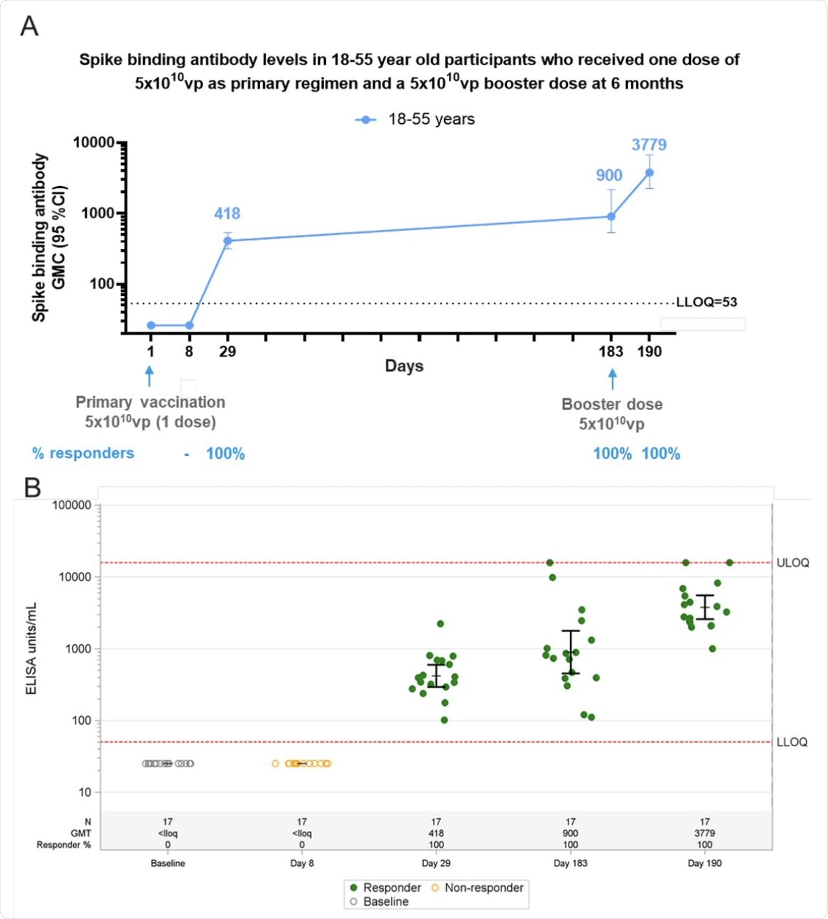Phase 1 participants, age 18–55 (N=27) years of age, were administered a single dose of Ad26.COV2.S (5×1010 vp) at Day 1 and 20 participants received a booster dose of Ad26.COV2.S (5×1010 vp) at approximately 6 months (Day 183) post primary vaccination and 17 participants had data available at Day 190. Serum spike binding antibodies against SARS-CoV-2 were evaluated in an S-ELISA up to 7 days post boost (Day 190). A) Participants18–55 years of age are represented with a blue line. GMCs are depicted above each time point and response rates are illustrated at the bottom of each panel. B) Dot plots representing the distribution of the participants per timepoint. N, GMC (ELISA Unit/mL) and percent responders are represented at the bottom of each plot. Grey open circles represent baseline binding antibody levels, green dots indicate that participants are responders and yellow open circles indicate that participants are non-responders.