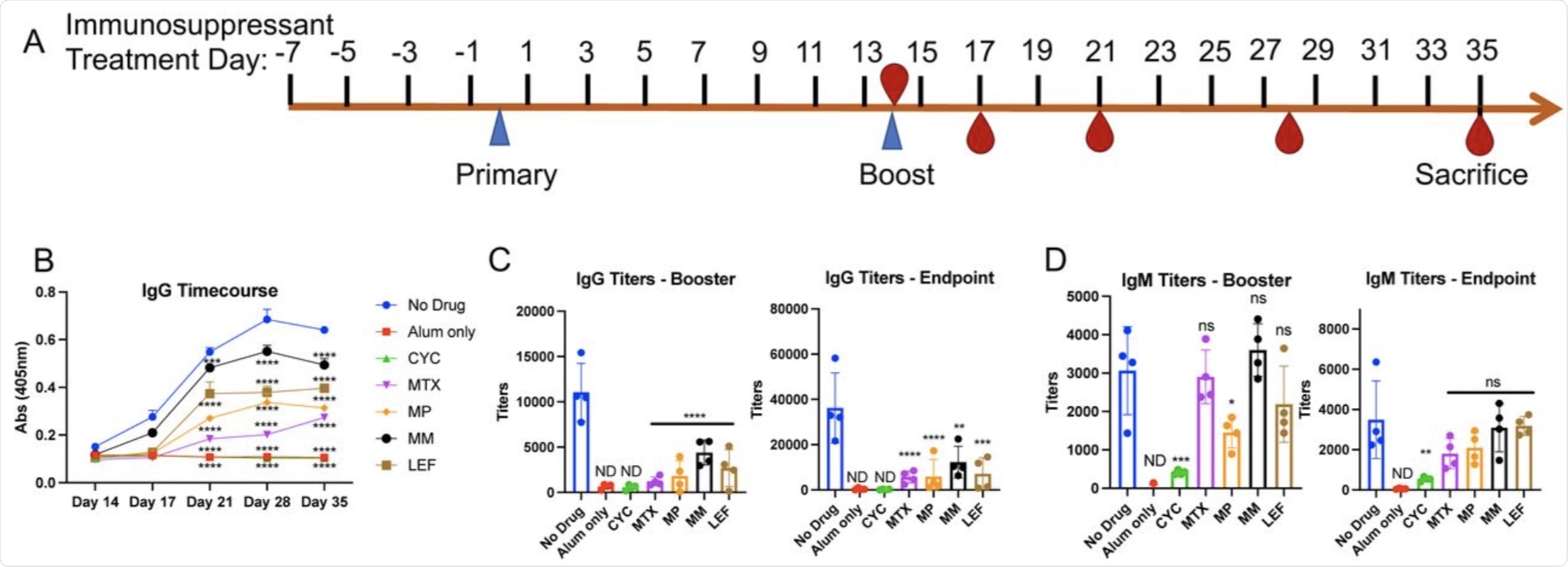 Changes in antibody levels to SARS-CoV-2 spike protein following immunosuppressant administration. A. Schematic of intraperitoneal SARS-CoV-2 spike protein immunization and immunosuppressant drug administration. Recombinant spike protein was injected at 0.5μg/50μl alum per mouse. Alum only mice received 50 μl of alum with no spike protein. Immunosuppressants were administered intraperitoneally at the indicated timepoints according to the concentrations in Supplementary Table 1. B. Serum was obtained from immunosuppressant-treated mice on days 14 (prior to booster immunization), 17, 21, 28, and 35 days (following booster immunization). ELISA was performed to determine serum IgG titers against spike protein. We did not detect IgG/IgM response to spike protein in the non-immunized mouse sera (alum only). Input was individual OD (405nm) values of sera at 1/3200 dilution and significance was determined for all time points following booster immunization. C. IgG and D. IgM titers after booster immunizations (day 21) and at endpoint (day 35). Averages of OD values at 405nm absorbance of technical replicates for individual mouse serum sample were used in regression curves to obtain titers (reciprocal serum dilutions) at absorbance of 0.5 at 405nm. Significance was determined as compared to No Drug control group. Alum only and CYC groups were non-detectable (ND).