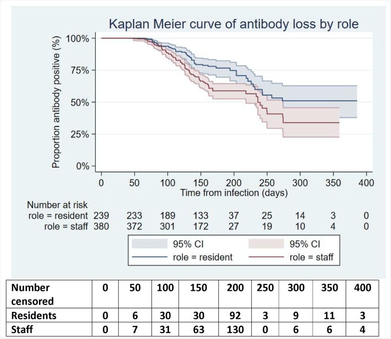 Kaplan Meier plot of time to antibody loss from estimated date of seroconversion in staff and residents with risk table and number censored (n=619).