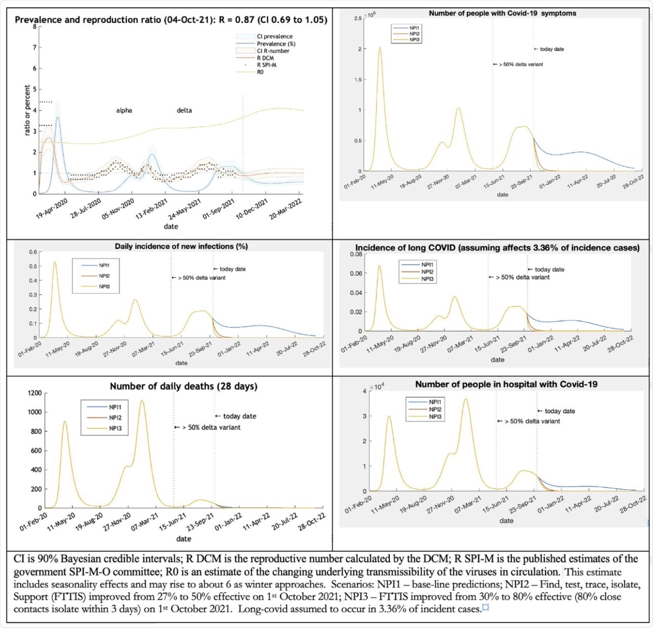 Projections of the UK epidemic curve – incidence rate, daily confirmed cases, and incidence of long- Covid to March or September 2022.