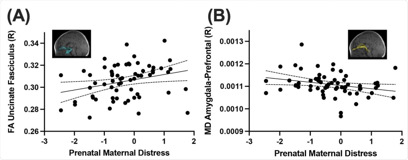 Prenatal maternal distress was significantly positively correlated with average fractional anisotropy (FA) in the right uncinate fasciculus (A), and negatively correlated with mean diffusivity (MD) in the right amygdala-prefrontal tract (B).