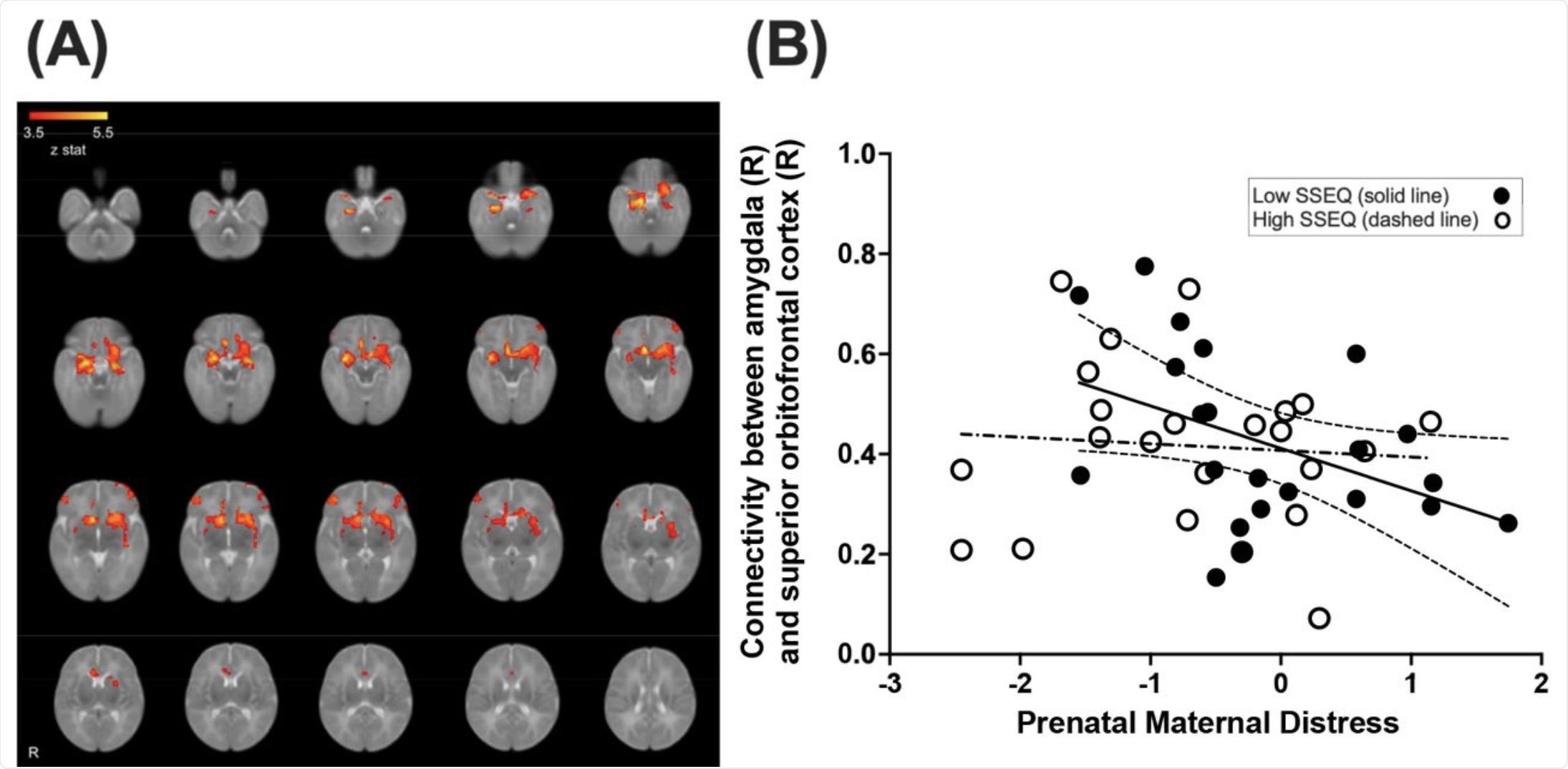 The scans showed that maternal prenatal distress affected mainly the right amygdala and the orbitofrontal cortex on the right side. Pregnant women with poor social support had a relationship between prenatal distress and reduced functional connectivity, but not those with good support.