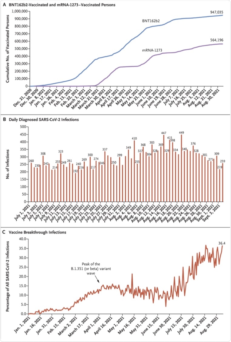 The percentage of all daily diagnosed SARS-CoV-2 infections that were vaccine (BNT162b2 or mRNA-1273) breakthrough infections increased gradually over time and reached 36.4% on September 5, 2021. Most vaccine breakthrough infections (77.2%) were recorded for the BNT162b2 vaccine.