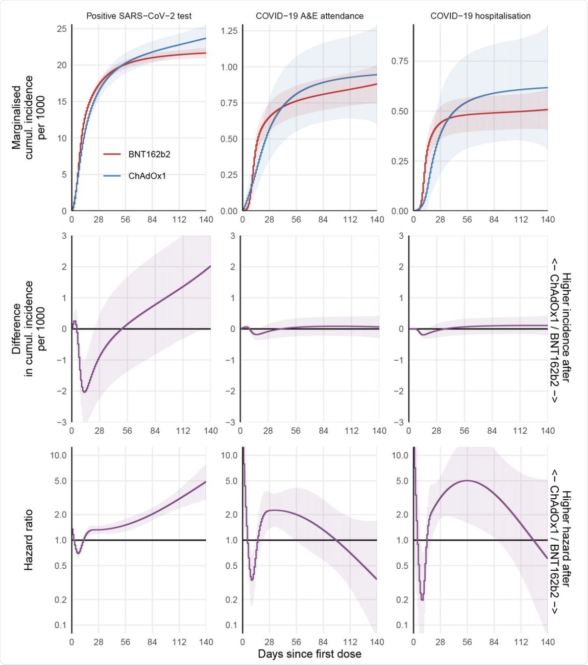 For comparative effectiveness, the researchers observed that post-vaccination, the ChAdOx1 versus BNT162b2 absolute risk difference per 1,000 people for a positive SARS-CoV-2 test, COVID-19 A&E attendances, and COVID-19 hospital admissions. They found that the outcomes were similar for those who received the BNT162b2 and ChAdOx1 COVID-19 vaccines.