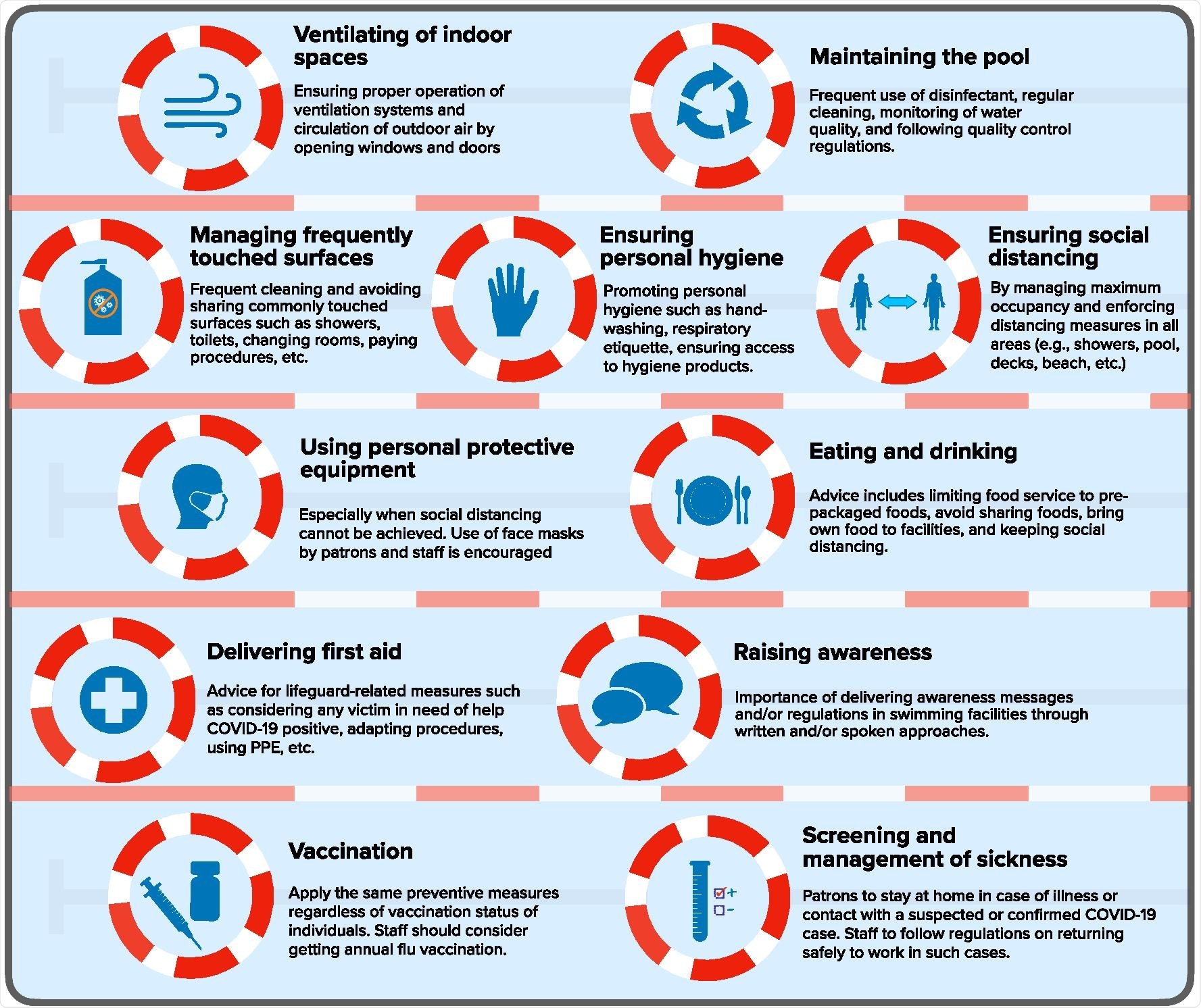 Other measures include providing cardiopulmonary resuscitation (CPR) equipment at the facility, revising the CPR protocol to suit the pandemic needs, and PPE for lifeguards. Some documents also suggested that lifeguards should follow social distancing measures and limit physical contact.
