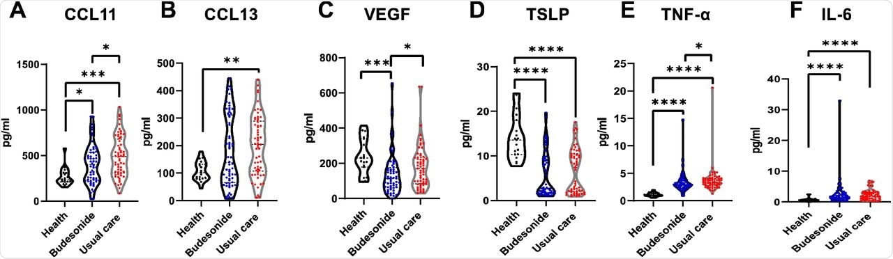 Persistence of systemic inflammation following 28-35 days of COVID-19 infection in the community, is dampened by inhaled budesonide. A-F) Violin plots comparing some mediator levels in the serum of healthy individuals (n=19), those in the usual care arm (n=60) and budesonide arm (n=62) of the study at 28-35 days following COVID-19 infection (see supplement S7 for further results). Data were analysed by Kruskal-Wallis with post-hoc Dunn’s test. * p<0.05, ** p<0.01, ***p<0.001, ****p<0.0001.