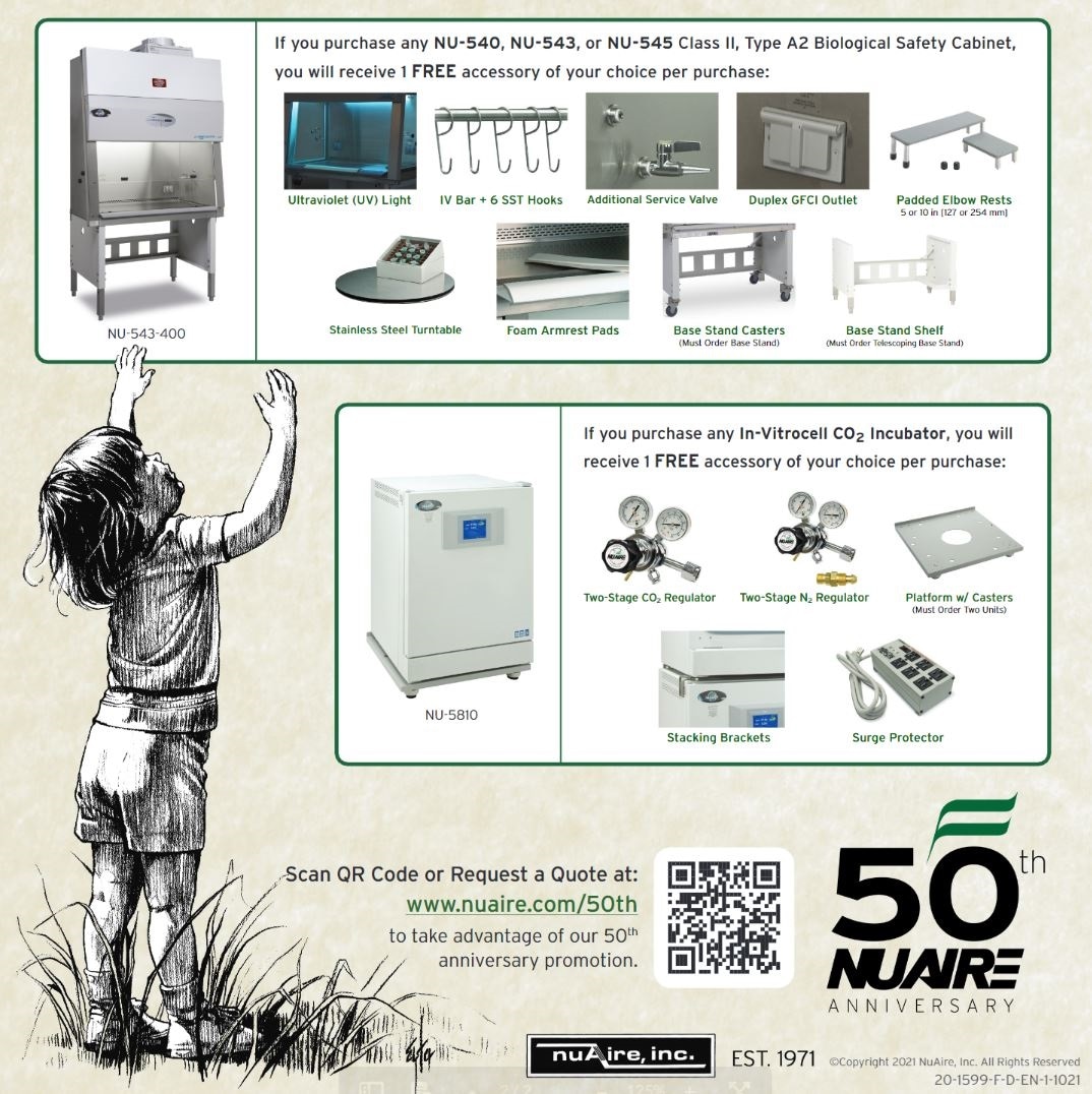 Go to: www.nuaire.com/50th and fill out embedded RFQ form noting your desired NuAire product and associated accessory or upgrade. Any automated or robotic entries will be disqualified. Form must be filled out by eligible customer. Once completed, an accredited NuAire distributer will reach out soon after with requested product quotes including free desired accessory or upgrade. Upon completion of purchase, the agreed upon NuAire product will arrive with promotional free accessory or upgrade already included in or attached to the purchased unit.