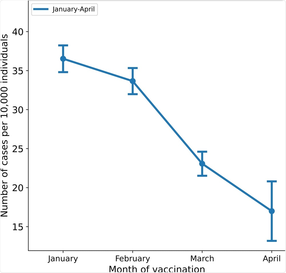 The results were similar across all ages groups. This increased risk reached 2.26-fold when comparing the individuals vaccinated in January to those vaccinated in April.