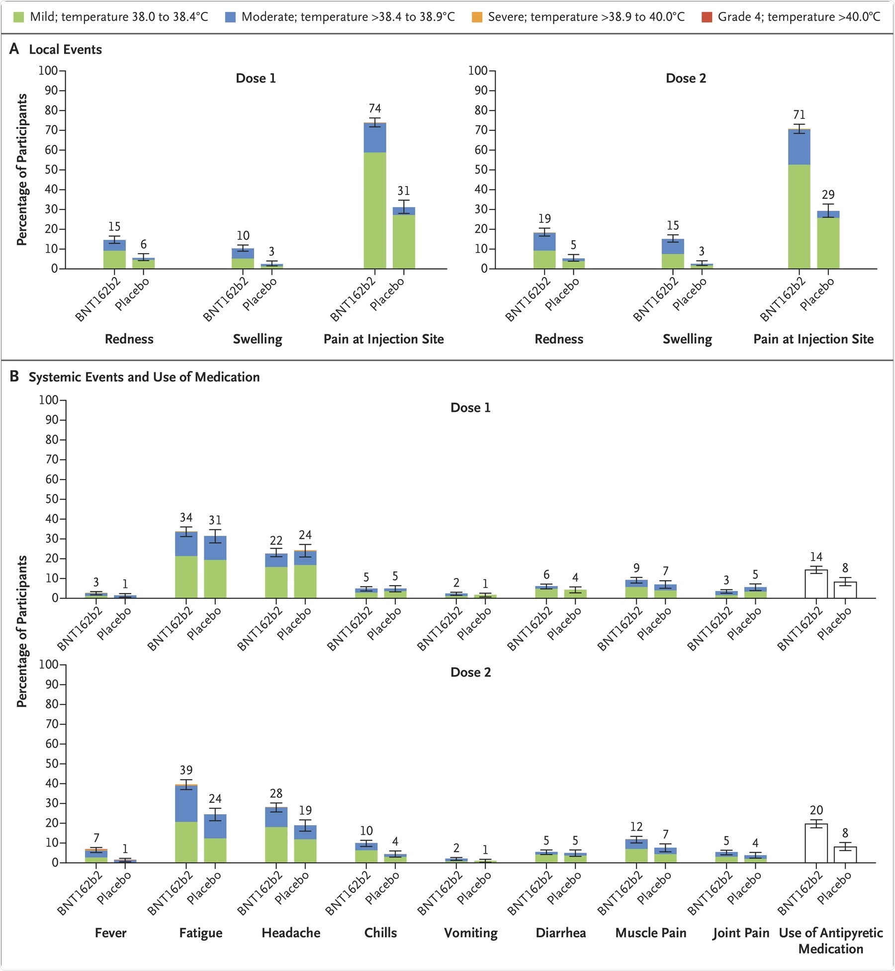 Phase II/III safety study indicated that local reactions and systemic events were mild to moderate and lasted for 1 or 2 days in the BNT162b2 recipient group. The most common local reaction was injection-site pain, followed by headache and fatigue. Furthermore, systemic events were more commonly reported after the second dose of the vaccine as compared to the first dose.