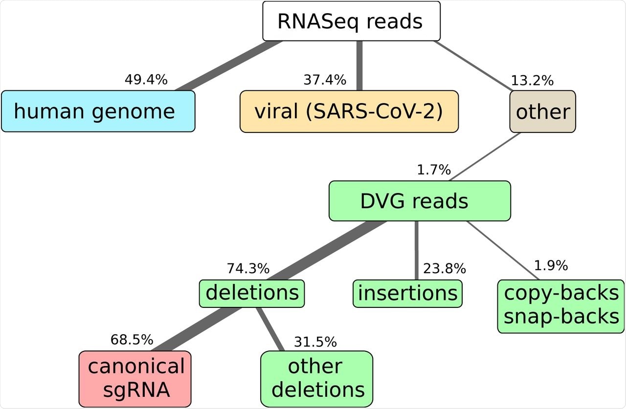 The researchers observed between 33-40% of reads mapped to the SARS-CoV-2 genome and a much smaller quantity of DVG reads, the most common of which were deletions. This suggests that DI-tector results can be used to quantify viral sgRNA data from NGS. The second most common DVG reads were insertions, followed by copy-back or snap-back results.