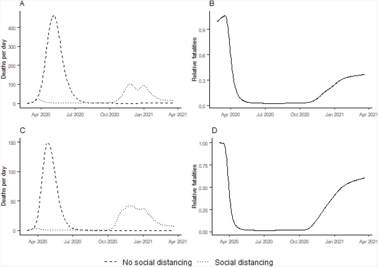 Based on model simulations, the team suggests that social distancing is more effective in low R0 situations and less in high R0. Applications of social distancing in high R0 situations resulted in multiple waves of outbreaks and U-shaped relative fatality curves, thus demonstrating that benefits are lost in the long term. Comparatively, the low R0 situations resulted in single outbreaks and L-shaped relative fatality curves.