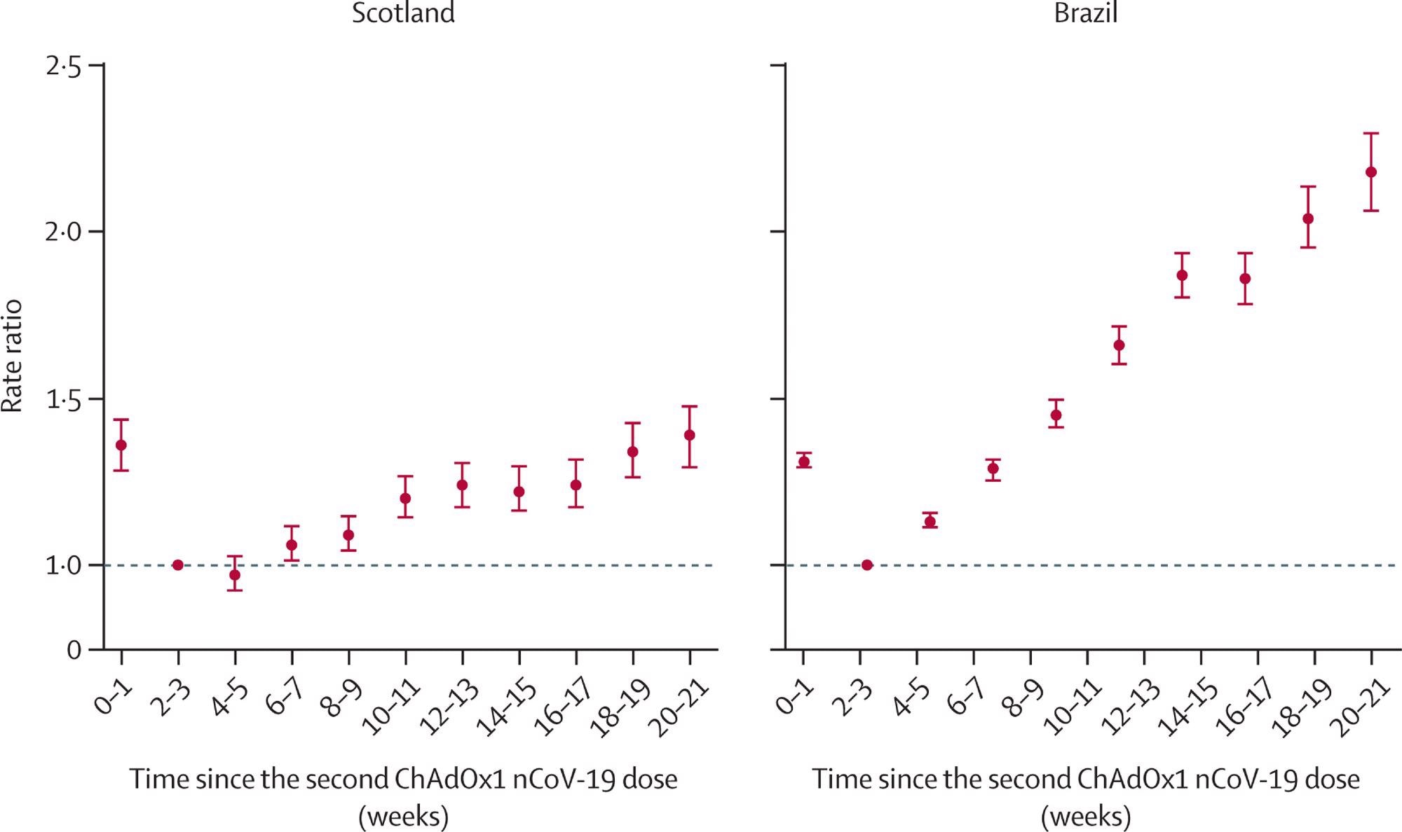 This was a retrospective population-level cohort study that looked at adult vaccine recipients in both countries who had received both doses of the vaccine. These were compared with unvaccinated people in Scotland and the first monitoring data following a single dose of the vaccine in Brazil.