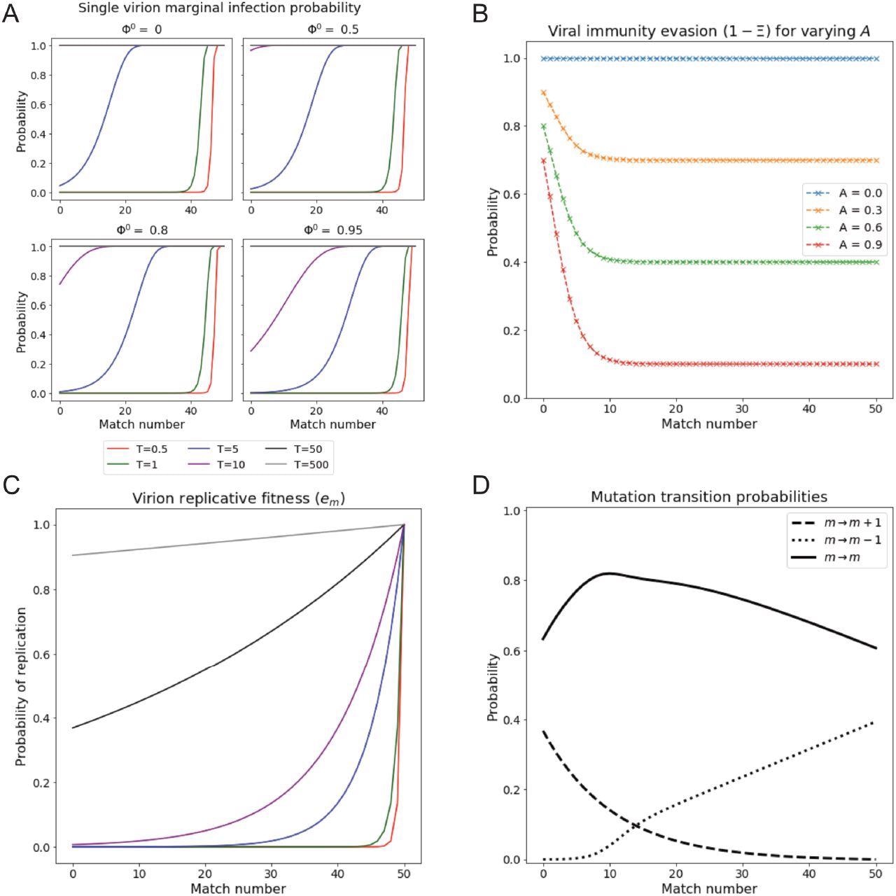 Single virion reproductive fitness and infection probability vary with match number and permissivity. (A) Infection probability of a single virus of match m, under conditions of various prior cell fillings Φ0 and for varying permissivity T. Higher occupancy results in notable decreases in infection probability especially for lower m. Note that infection probabilities, unlike em (Panel C), exhibit a shoulder at high m. (B) Probability of virus to survive immune response as a function of match m, for various immunity levels A. Immune response saturates with increasing m above around m = 14, where the level is 1 − A. (C) Replicative fitness (probability of replication) as a function of match number for varying T. Legend shared with Panel A. (D) Replication-associated mutation probability as a function of m. Note that the probabilities of increasing and decreasing m via mutation are equal at m = 14, giving the mode of the Natural initial distribution.