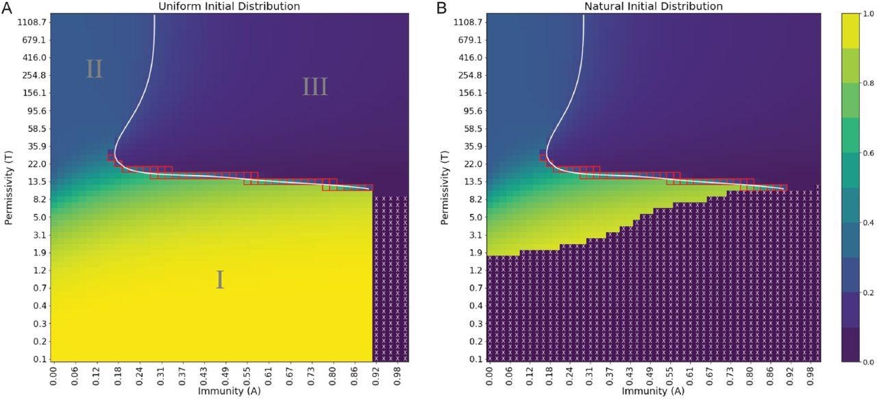 Order parameter at steady state exhibits distinct regions of behavior and extinction, separated by phase boundaries of varying order. (A) Uniform initial distribution. (B) Natural initial distribution. Order parameter values are depicted in a continuous range of colors from purple (0.0) to yellow (1.0). Purple regions with white X’s denote viral extinction before the end of simulations. The white line is a spline fit to locations of maximal difference in order parameter at fixed permissivity or immunity. Red squares denote points where Pm is bimodal. A reminder that the natural scale for permissivity is between T ≈ 1 and T ≈ 70, where most changes in behavior are expected to occur.