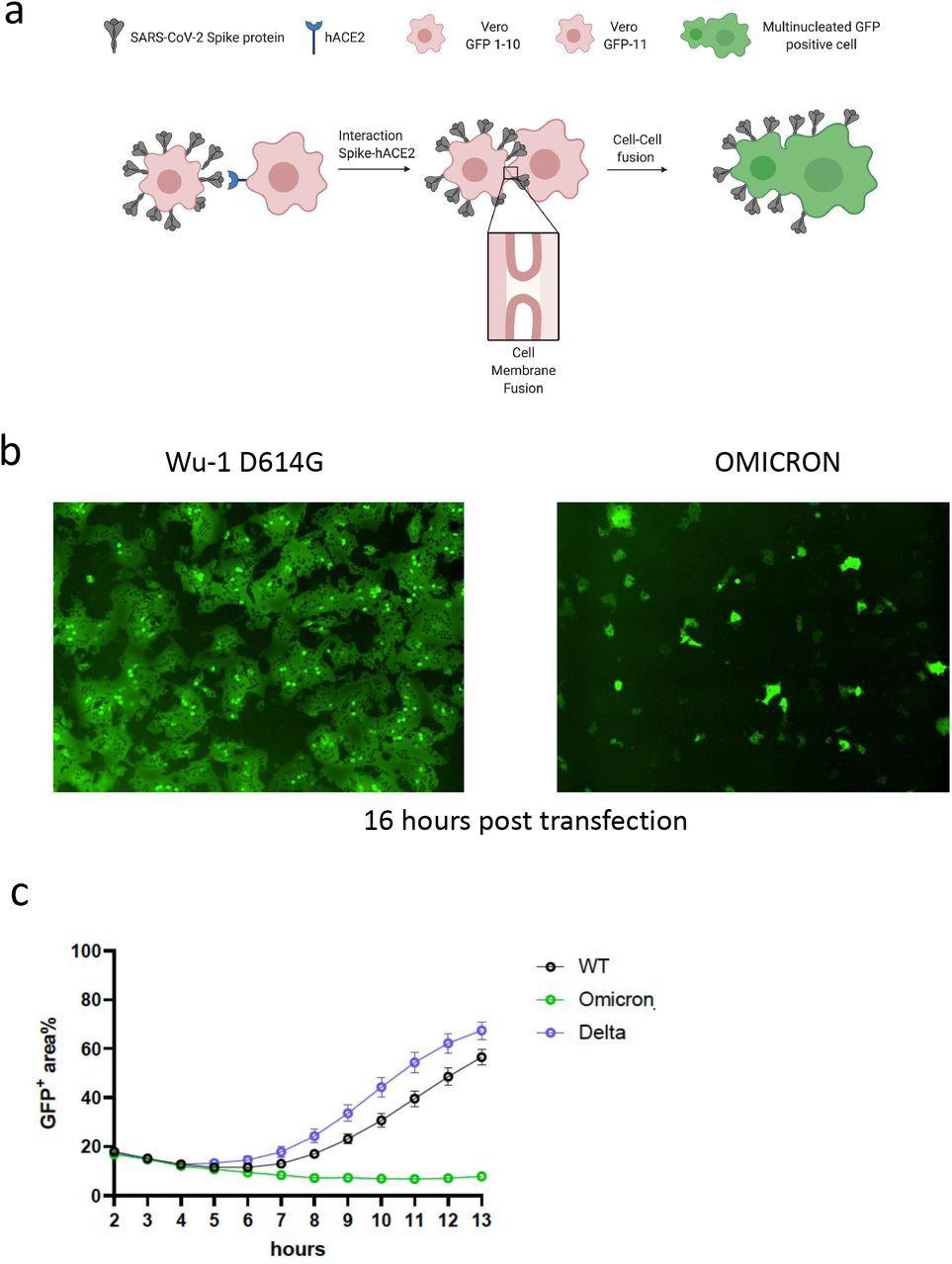 The authors used a split green fluorescent protein (GFP) system to monitor cell-cell fusion in real-time while testing the Omicron spike protein. The authors transfected spike-bearing plasmids into 293T cells expressing GFP1-10 and mixed them with Vero cells stably expressing GFP-11 to allow the GFP signal to be detected and measured upon cell-cell fusion. The authors observed increased fusion for the Delta variant when compared to the previous D614G wild-type spike. Despite being expressed, the Omicron spike resulted in very poor fusion.