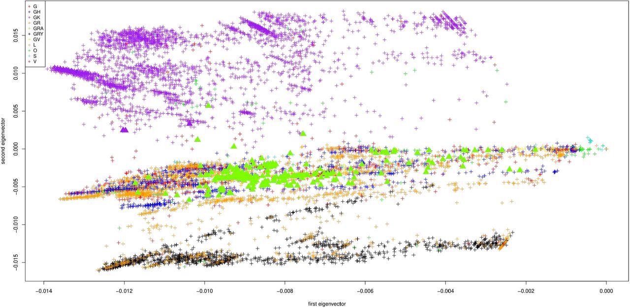 First two principal components of the Jaccard matrix, color coded by the clade of each sequence (clade G in red, GH in blue, GK in purple, GR in orange, GRA in green, GRY in black, GV in yellow, L in maroon, O in light green, S in turquoise, V in brown). Displayed are the 10013 sequences from GISAID, one point per sequence. The omicron samples are depicted as triangles.