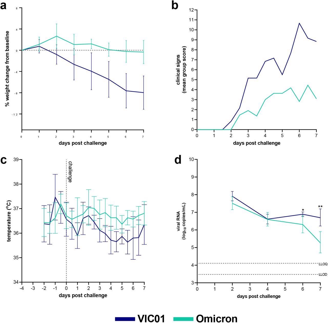 Omicron and VIC01 Challenge in naïve hamsters. Hamsters were monitored for (a) weight change, (b) clinical signs and (c) temperature following challenge with VIC01 or the Omicron variant. Hamsters challenged with VIC01 experienced significantly more total weight loss (area under the curve, P=0.0007) than hamsters challenged with Omicron. Throat swabs were collected at days 2, 4, 6 and 7 for all virus-challenged groups. (d) Viral RNA was quantified by RT-qPCR at all sample time points. Lines show group geometric means, error bars represent standard deviation. The dashed horizontal lines show the lower limit of quantification (LLOQ) and the lower limit of detection (LLOD). At day 6 and day 7 Omicron challenged hamsters shed significantly less virus (P=0.0136 and P=0.0012 respectively) than hamsters infected with VIC01. There was no significant difference between total amount of viral RNA shed.