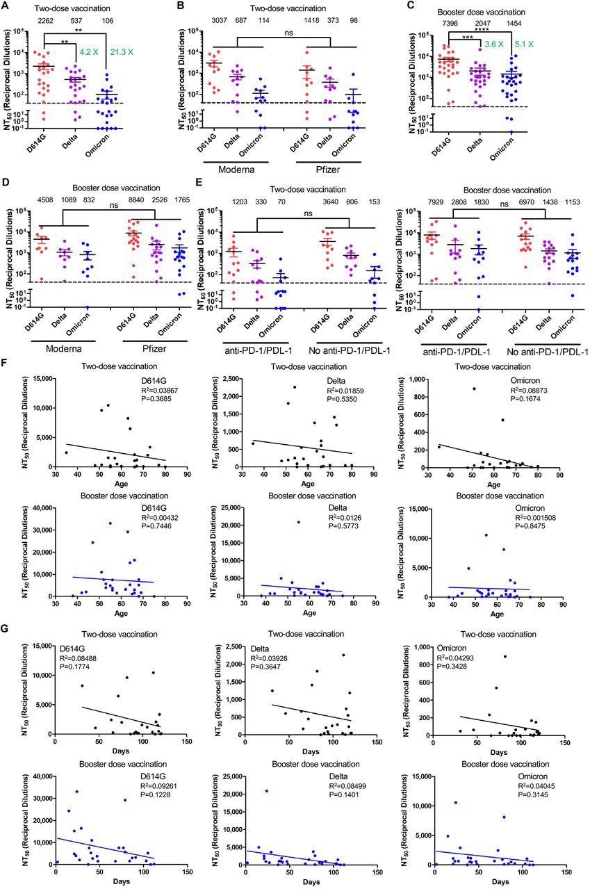 The Omicron variant exhibits strong immune-escape in two-dose-vaccinated patients with cancer which is overcome by booster vaccinations. Gaussia luciferase reporter gene-bearing lentiviral vector was pseudotyped with spike from SARS-CoV-2 variant of interest, and pseudotyped viruses were then incubated with serially-diluted patient serum before being used to infect HEK293T-ACE2 cells. Culture media were changed after overnight infection and were measured for the luciferase activity at 48 and 72 hrs post-infection. (A and B) Sera from 23 patients with solid cancer collected after the second mRNA vaccine dose (12 mRNA-1273 and 11 BNT16b2) were used to neutralize pseudotyped virus bearing the spike of D614G, Delta and Omicron variants, and resulting 50% neutralization titers (NT50) were calculated. (C and D) Sera from 27 patients with solid cancer collected after booster vaccination (9 mRNA-1273 and 18 BNT16b2) were used to neutralize pseudotyped viruses of D614G, Delta or Omicron variants, with NT50 calculated. (E) NT50 values against D614G, Delta and Omicron variants in cancer patients, with or without anti-PD-1/PDL-1 treatments: two-dose vaccination and booster dose vaccination. (F) Correlative analyses between NT50 values against variants and patient’s age: two-dose vaccination and booster vaccination. (G) Correlative analyses between NT50 against variants and sera collection days: two-dose vaccination and booster vaccination. In all cases, mean NT50 values are displayed at the top of each plot; bars represent mean +/-standard error, and significance is determined by one-way ANOVA with Bonferroni’s multiple testing correction. P-values are represented as ** p < 0.01, *** p < 0.001, **** p < 0.0001; ns, not significant (defined as P > 0.05).