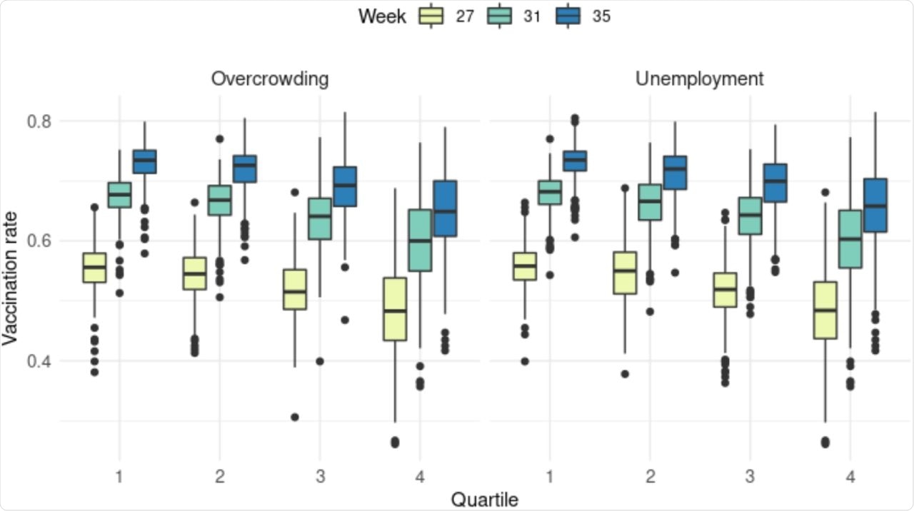 The differences in percentile points-based vaccination rates between the first and fourth quartiles of unemployment and overcrowding indicators remained similar across the weeks. At weeks 27, 31, and 35, the difference in vaccination rate of unemployment was 7.6, 8, and 7.9 with a 95% CI of [6.6; 8.7], [7.0; 9.0], and [6.9; 8.9], respectively. The difference in vaccination rate of overcrowding at weeks 27, 31, and 35 were 6.9, 7.6, and 8.2 with a 95% CI of [5.7; 8.1], [6.6; 8.8], and [7.2; 9.1], respectively.