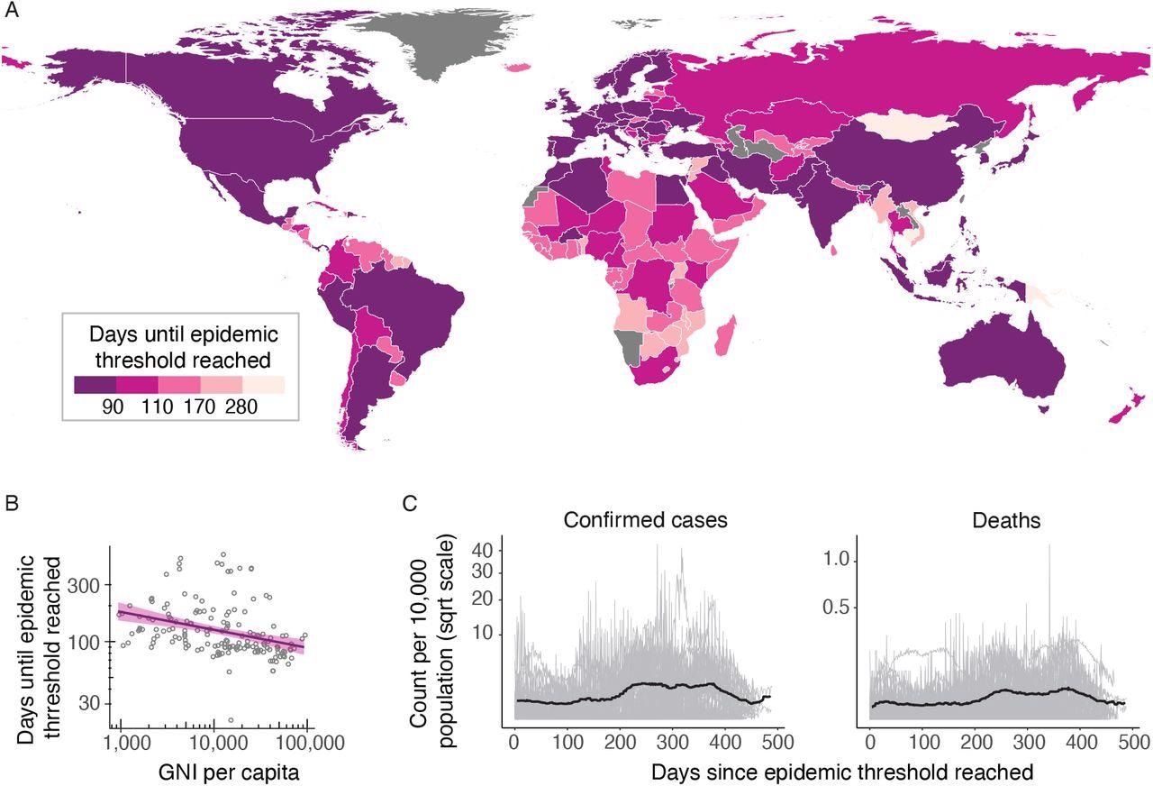 (A) Choropleth shows the number of days since the emergence of the first cases in China on the 31st of December, 2019, until the cumulative number of deaths in each country surpassed 10. Countries with darker colors passed the threshold earlier than the lighter colored countries. After starting in China, epidemics occurred in Europe, the Middle East and North America before moving south to South America, Africa and the Pacific. (B) Scatter plot showing the correlation between the days until the epidemic threshold was reached in each country against the GNI per capita for that country showing a negative trend, i.e., the pandemic spread to higher GNI per capita countries first. Linear regression line in purple with a shaded 95% confidence interval (C) Time series of the daily number of confirmed cases (left) and deaths (right) per 10,000 population among the countries that have evidence of a second wave (light grey), and the 7-day rolling median of the mean across countries (black line). For each country, the time is taken relative to the date at which the epidemic became established.