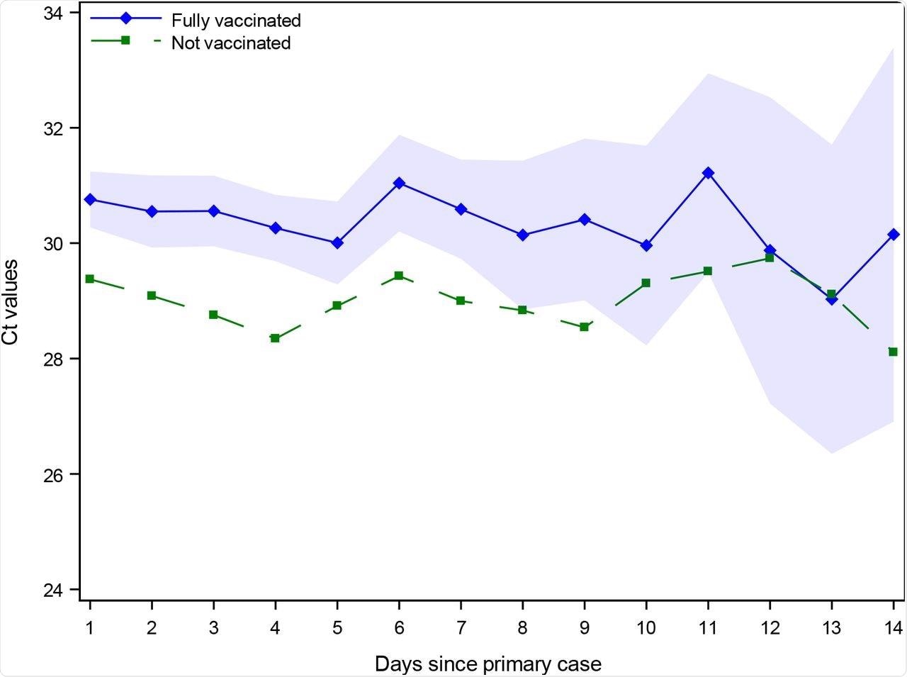 Ct values across vaccinated and unvaccinated positive secondary cases.