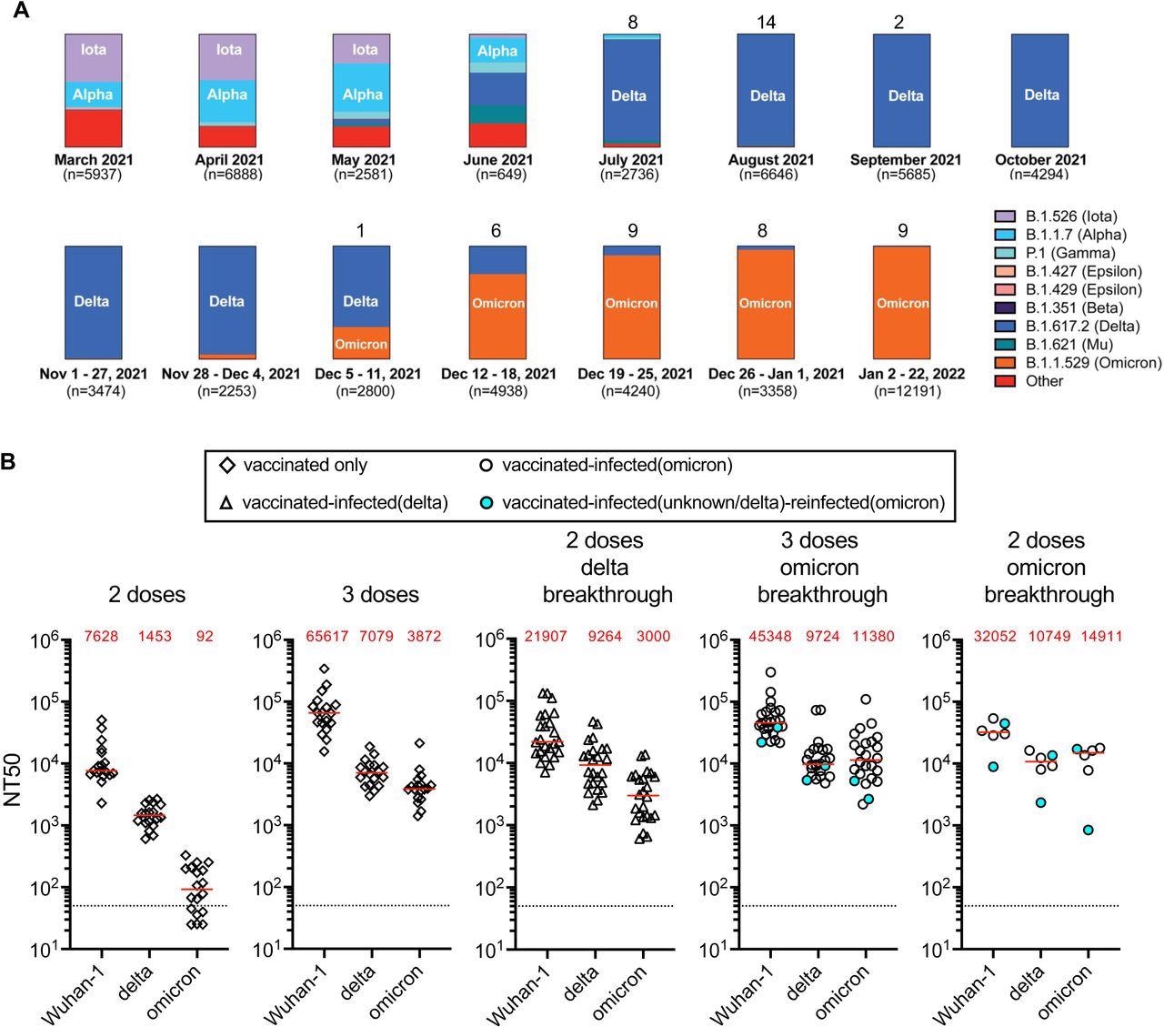 Variant prevalence and plasma neutralization titers. Panel A shows the frequency of variants over selected periods of weeks or months based on viral genome sequences obtained from samples collected in New York City and downloaded from NYC Department of Health and Mental Hygiene (https://github.com/nychealth/coronavirus-data/blob/master/variants/variant-epi-data.csv) on February 4, 2022. Numbers on top of bar charts indicate number of PCR positive samples identified over that period in our cohort. Panel B shows the NT50 values against Wuhan-1, delta (B.1.617) or omicron (B.1.1.529). Plasma samples were collected from uninfected, vaccinated individuals 29-53 days after the 2nd or 3rd dose of an mRNA vaccine (BNT162b2, Pfizer/mRNA-1283, Moderna) or from individuals that had been vaccinated with 2 or 3 doses of an mRNA vaccine and experienced one or two breakthrough infections with samples collected between 14-55 days after the latest positive test for infection. Horizontal lines and red values in each group indicated median NT50 values.