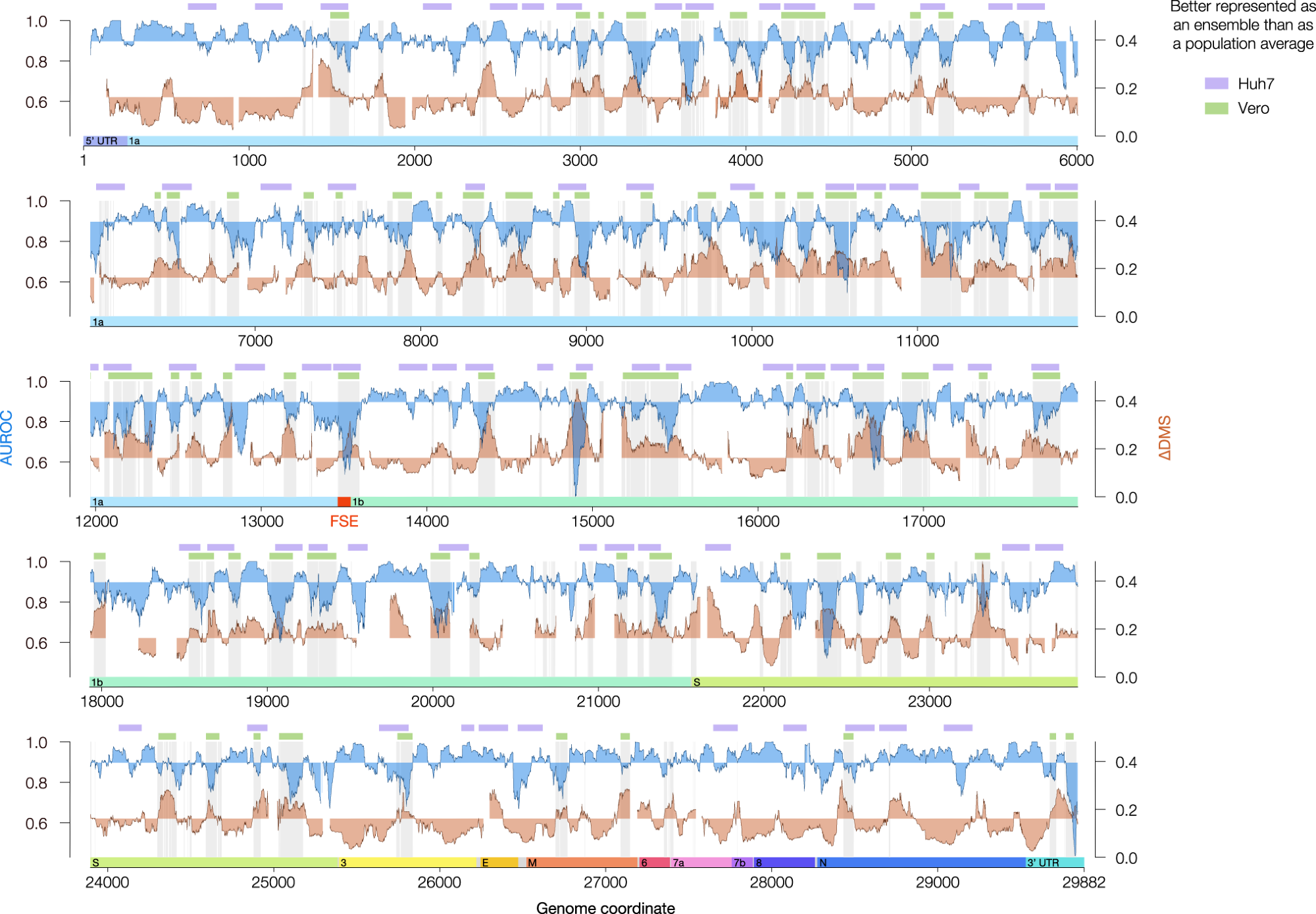 The majority of the SARS-CoV-2 genome was also found to form alternative structures. Decoy structures that were similar to the true structures were reported to have high AUROC, while those different from the true structures had low AUROC. FSEs also formed at least two distinct structures in both Vero and Huh7 cells.