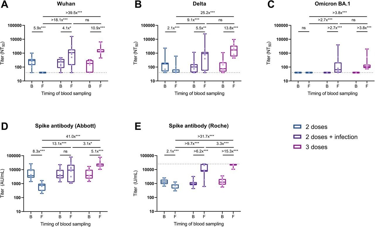 The fold-change values are estimated ratios of geometric means for antibody titers based on the GEE model (ns: not significant; *P<0.05; **P<0.01; ***P<0.001). Abbreviations: AU, arbitrary units; B, baseline; F, follow-up; GEE, generalized estimating equation; LOD, limits of detection; NT50, 50% neutralization titer; SARS-CoV-2, severe acute respiratory syndrome coronavirus 2.