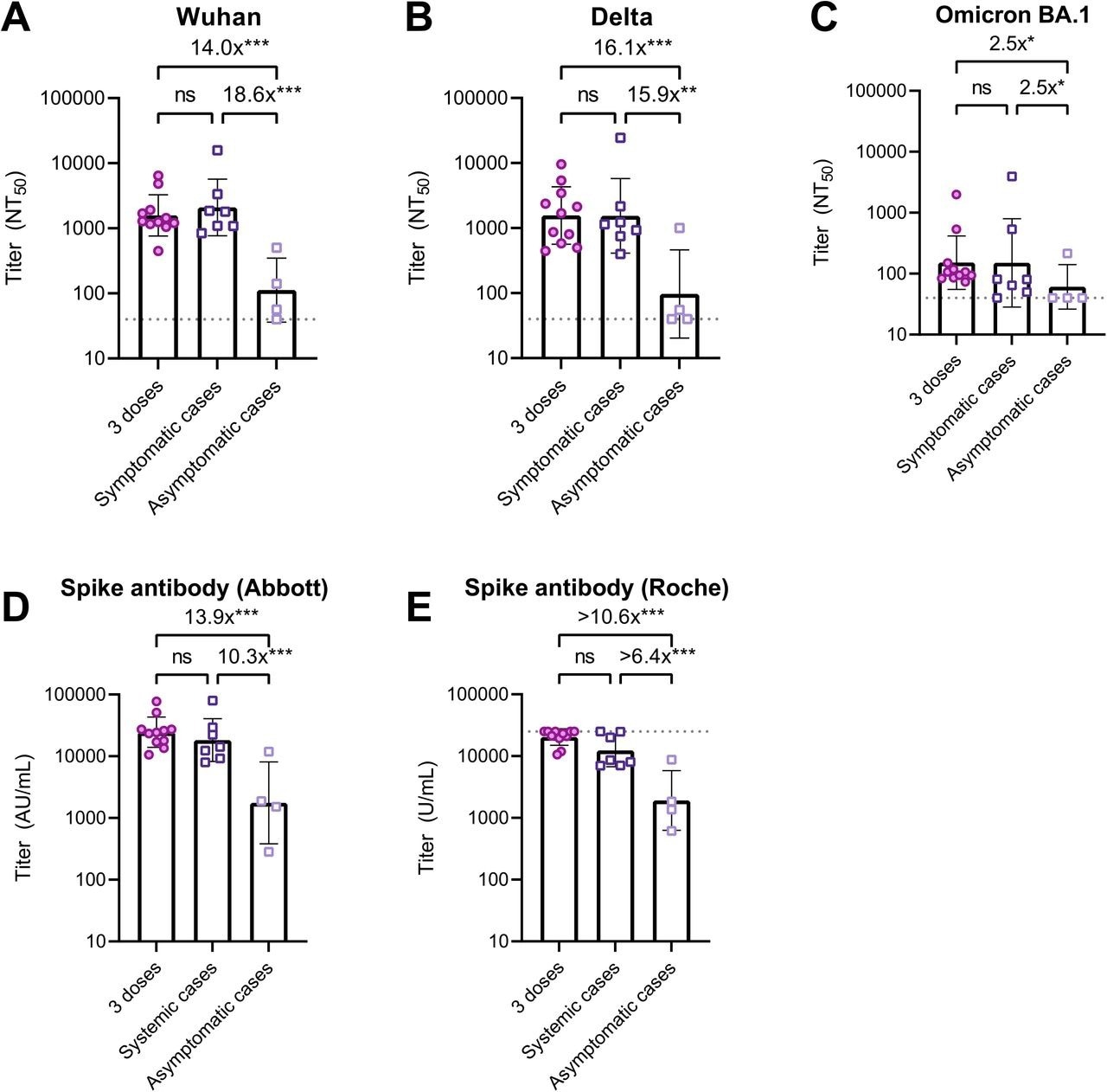 Neutralizing and spike antibody titers after three vaccine doses, symptomatic and asymptomatic breakthrough infections. Shown are NAb titers against the original Wuhan strain (A), the Delta variant (B), and the Omicron BA.1 variant (C) determined by 50% focus reduction neutralization test (FRNT50) using the serum at follow-up. Also shown are anti-spike antibody titers measured with the Abbott reagent (D) and the Roche reagent (E) using the serum at follow-up.