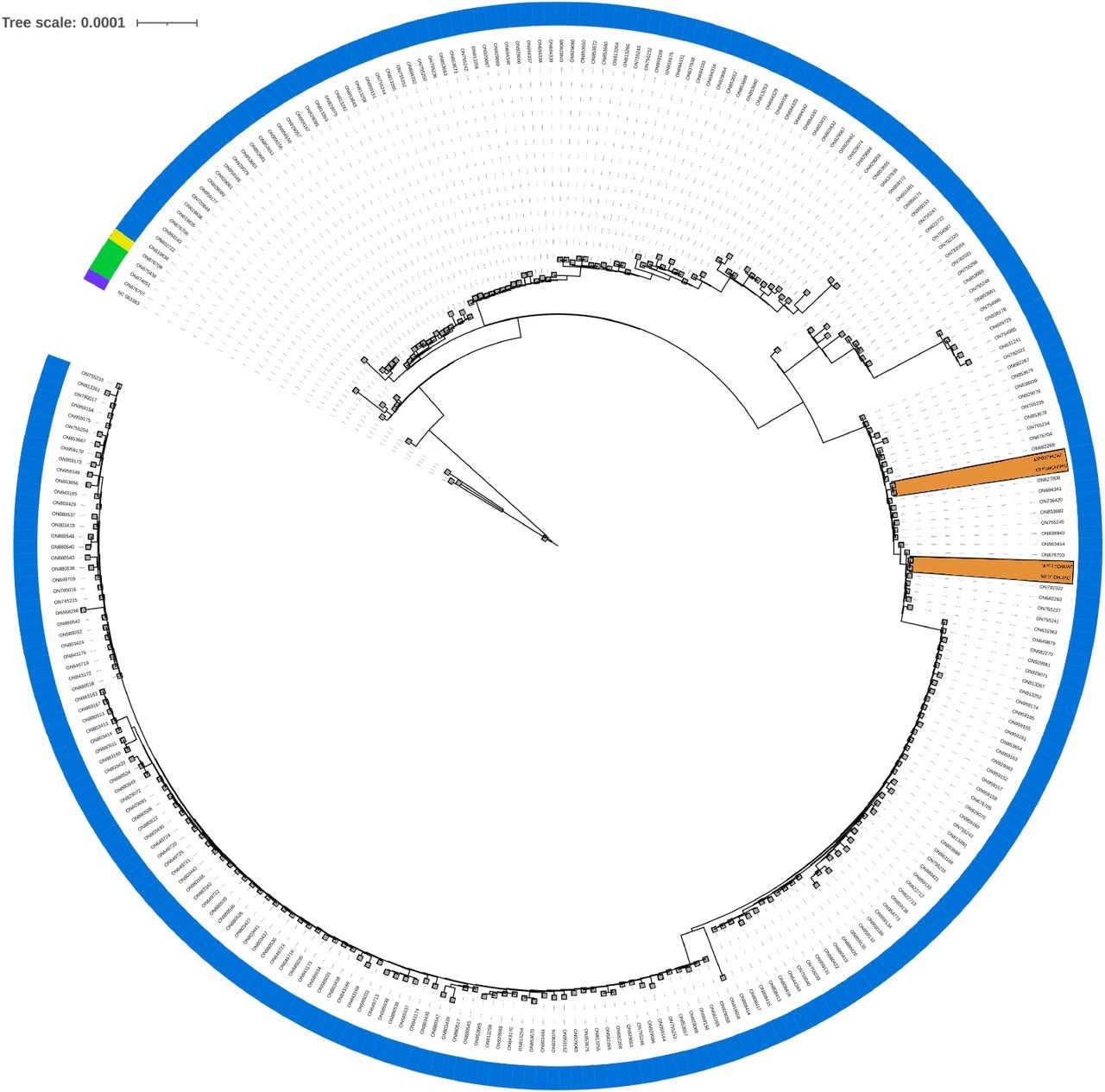 Phylogenomic tree. Phylogenomic analysis of the present study’s samples, comparing them to all complete MPXV genomes available in GenBank to date (2022-07-18, 275 genomes from taxid 10244). This does not pretend to infer the evolution of the virus, only to locate the most similar entries to the samples in this study. A color strip indicates each sample’s lineage (A: purple, A.1.1: yellow, A.2: green, B.1: blue), and orange areas highlight the study’s samples.
