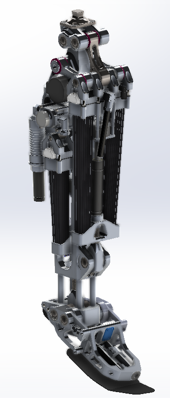 Adaract’s synthetic/artificial muscle is a hydraulically powered, variable recruitment actuator. Each muscle “fiber” can be activated individually, allowing incredible adaptability and power efficiency. The way that these muscles contract is by pumping a pressurized fluid into them, causing each fiber to expand radially and contract axially. This type of contraction, coupled with an appropriate linkage system, allows the muscles to provide our device with a full range of motion in both the knee and ankle joints with approximately 250 lb-ft of joint torque – this is about twice the torque of a Toyota Corolla.