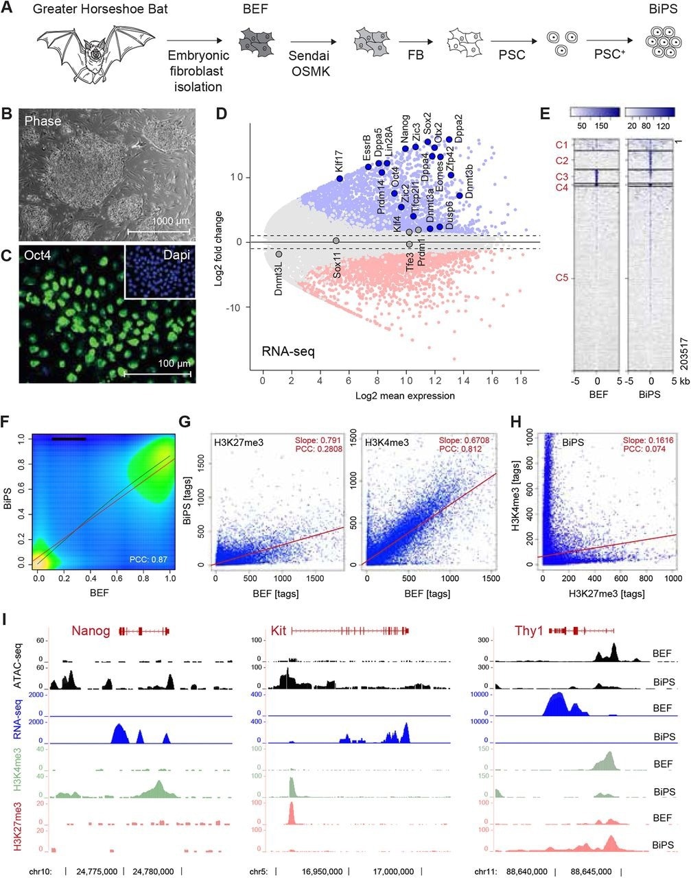 Derivation of pluripotent bat stem cells. (A) Illustration of the bat pluripotent stem cell derivation strategy. BEF, embryonic fibroblasts; OSMK, Oct4, Sox2, cMyc, Klf4; FB, fibroblast medium; PSC, pluripotent stem cell medium; PSC+, PSC with additives. (B) Morphology of established BiPS cell colonies grown on mouse embryonic fibroblasts. (C) Immunofluorescent detection of Oct4 in BiPS cells. (D) MA plot of RNA-seq data illustrating the transcriptional differences between bat embryonic fibroblast (BEF) and pluripotent stem cells (BiPS). Selected genes with known functions in the establishment or maintenance of pluripotency are highlighted. (E) Kmean cluster analysis of ATAC-seq signals obtained from BEF or BiPS cells. C, cluster. (F), Density plot of RRBS results obtained from BEF and BiPS cells. PCC, Pearson correlation coefficient. (G) Scatter plots of histone 3 methylation status at K4 (activating chromatin modification) or K27 (repressing chromatin modification) after ChIP-seq from BEF or BiPS cells as indicated. (H)Scatter plot of H3K4me3 and H3K27me3 in BiPS cells illustrating the occurrence of bivalent chromatin sites in BiPS cells. (I) RNA-seq, ATAC-seq and H3K4me3 or H3K27me3 ChIP-seq signals of selected genes with known roles in reprogramming that are activated (Nanog, Kit) or repressed (Thy1) in BiPS when compared to BEF cells.