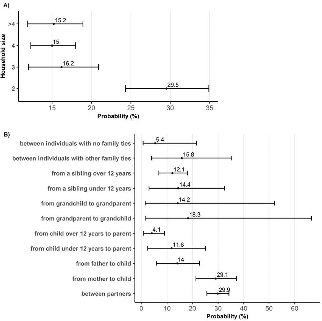 Estimated probabilities (%) of person-to-person transmission according to (A) household size and (B) family ties. Median, 95% credible interval.