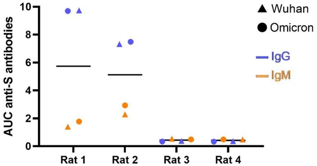 Serum anti-SARS-CoV-2 spike IgM and IgG antibody titers in rats. ELISA antibody reactivities against Wuhan and Omicron spike antigens as shown as area under the curve (AUC) of optical density values from serum titrations. Rat 1 developed a severe condition and was euthanized 3 days after symptoms onset. Rat 2 was minimally affected. Rat 3 and Rat 4 were two uninfected rats. Rats 1 and 2 presented very high IgG titers recognizing both spikes.