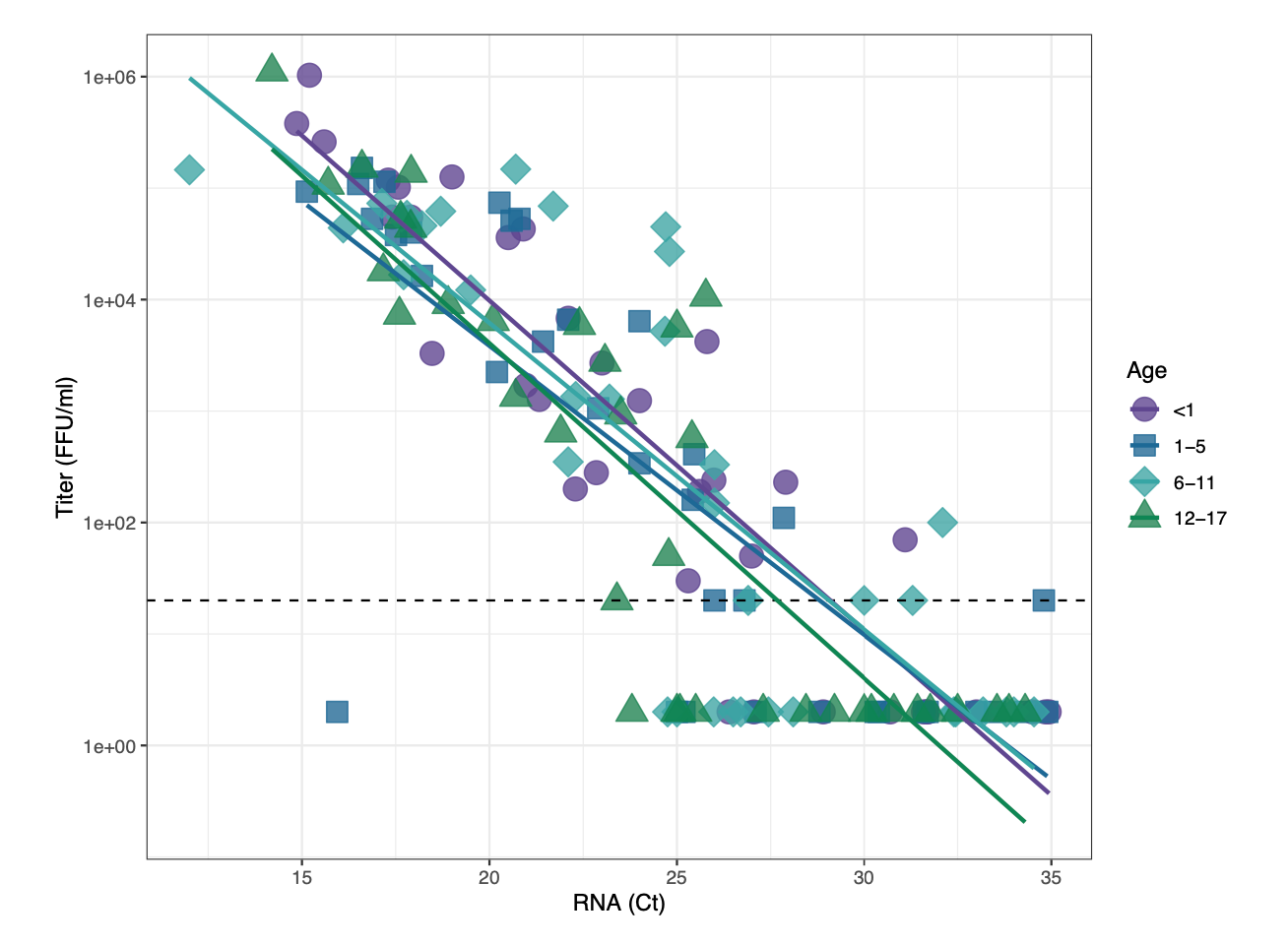 SARS-CoV-2 viral infectivity does not vary by age in a pediatric population. A set of 144 clinical samples from children infected with SARS-CoV-2 was used to examine the relationship between infectious virus titer and RNA viral load as a function of patient age. Individual specimen measurements of E gene RNA levels (CT) on the x-axis are plotted against viral titer, as measured in focus forming units (FFU/mL) on the y-axis. Dashed line indicates the limit of detection for infectious titer (20 FFU/mL). Samples for which we could not measure a viral titer were assigned fixed values of one-tenth the limit of detection (2 FFU/mL). Lines of best fit were generated by linear regression on log-transformed titer data as a function of CT and age group.