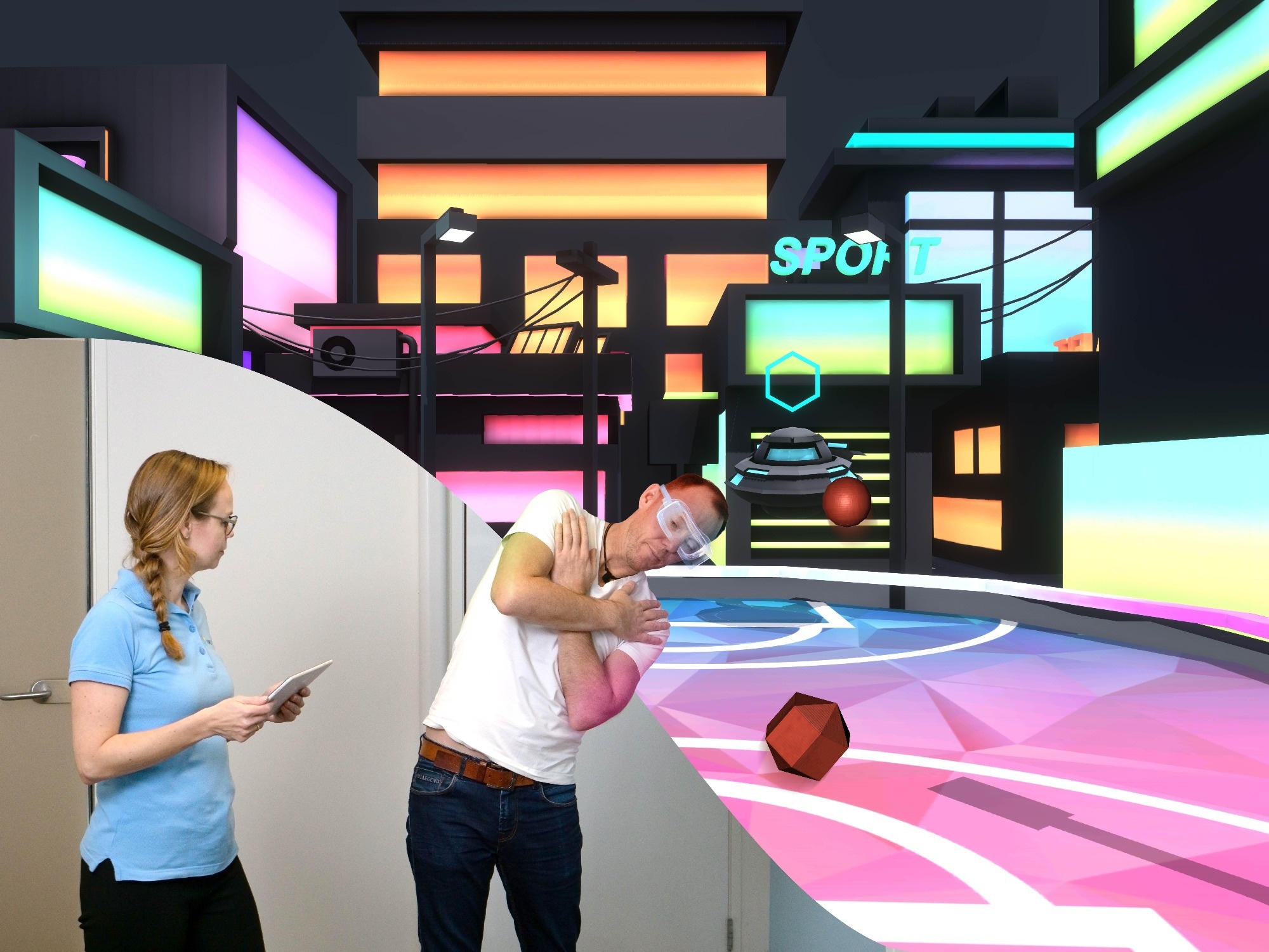 For instance, to evaluate a rotation-based exercise, we built a city-like game where patients can retrain neck movement by watching a car cross the street or train the proprioception and coordination of the muscles by letting the patient complete a gaze maze, a maze you solve by moving your head, in VR.