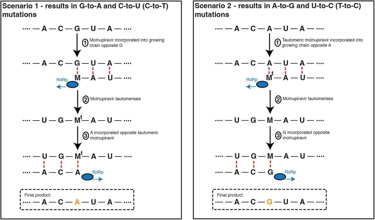 Molnupiravir drives G-to-A and C-to-U (C-to-T) mutations, and to a lesser extent A-to-G and T-to-U (T-to-C) mutations. In the most common scenario, shown on the left-hand side, M is incorporated opposite G nucleotides. It can then pair to A in subsequent replication, creating a G-to-A mutation. If the original G resulted from negative strand synthesis from a coding-strand C, then the G-to-A change ultimately creates a C-to-U coding change (Fig. S1). In the second, less common, scenario shown at the right hand side M is initially incorporated by pairing with A, which can result in an A-to-G mutation or, if the original A came from a coding U, a U-to-C mutation.