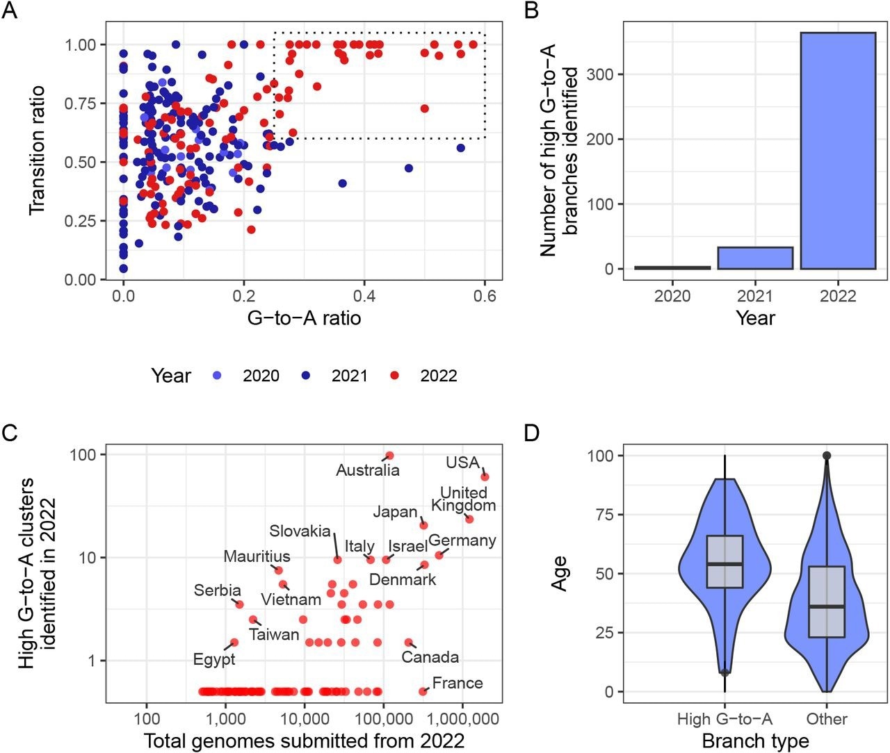 A new mutational signature emerged with high G-to-A and high transition ratio emerged in 2022 in some countries in global sequencing databases. (A) Each point in this scatterplot represents a branch from the mutation-annotated tree with >20 substitutions. Points are positioned according the proportion of the branch’s mutations that are G-to-A (x) or any transition mutation (y), and coloured by the year in which they occurred. A boxed region with higher G-to-A and almost exclusively transition mutations occurs only in 2022. (B) A count of the number of branches which satisfy a specific criterion (G-to-A ratio >= 25%, C-to-T ratio >= 20% transition ratio > 95%, total mutations > 10). (C) A comparison of number of total genomes with number of identified high G-to-A clusters (using the same criterion as B). Note logarithmic axes (semi-log, with the truncated line representing zero). For example, Australia has 97 clusters from a total of 119,194 genomes, whereas France has 0 clusters from 313,680 genomes. (D) A comparison of the age distributions for clusters with >10 mutations from the USA, partitioned by whether or not they satisfy the high G-to-A criterion. High G-to-A clusters correspond to older individuals.