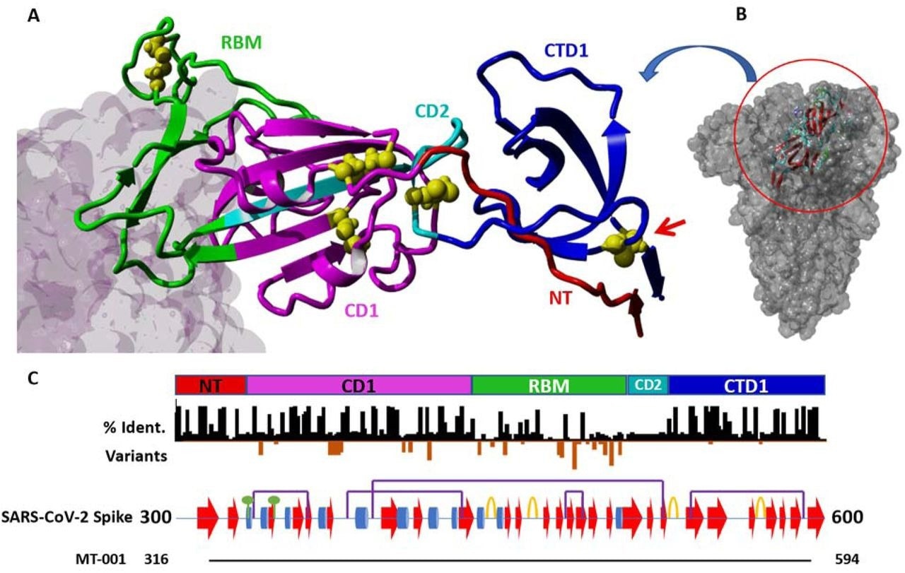Detail of the SARS-CoV-2 spike protein in the region 300-600 and MT-001 construct design. A) Structure of MT-001 construct derived from PDB IDs 7BYR and 7KNE. The RBD construct is color-coded by annotated blocks of amino acid sequence ("regions," see panel C and ref. 45). Cysteines are shown as yellow balls. The ligand of the RBM, ACE2 (from 7KNE), is shown as a gray molecular surface (left). B) The MT-001 construct (ribbon) is shown in the context of the full-length spike trimer (space-filling model). C) Schematic of the regions shown in (A). Top: Color-coded region key for the MT-001 construct in (A). NT: N-terminal region (residues 316-332, red); CD1: "core domain 1" region (333-436, magenta); RBM: receptor binding motif (437-508, green); CD2: "core domain 2" region (509-527, cyan); CTD1: "C-terminal domain 1" region (528-594, blue). A red arrow indicates the 538-590 disulfide bond that stabilizes CTD1. Middle: Black bars - Sequence identity per residue between SARS-CoV-2 spike and representative members of the coronavirus superfamily, demonstrating highly conserved regions N- and C-terminal to the RBM (STable 1). Orange bars - Sites of and frequency of mutations in characterized SARS-CoV-2 variants (3). Lower: Schematic showing the secondary structure and post-translational modifications in the region from residues 300-600 in the SARS-CoV-2 spike protein. Alpha helices are shown as blue cylinders, beta sheets as red arrows, and turns as orange loops. Disulfide bonds are denoted with purple bridges and N-linked glycosylation sites with green circles. Bottom: Alignment of the MT-001 construct with the visualized region.