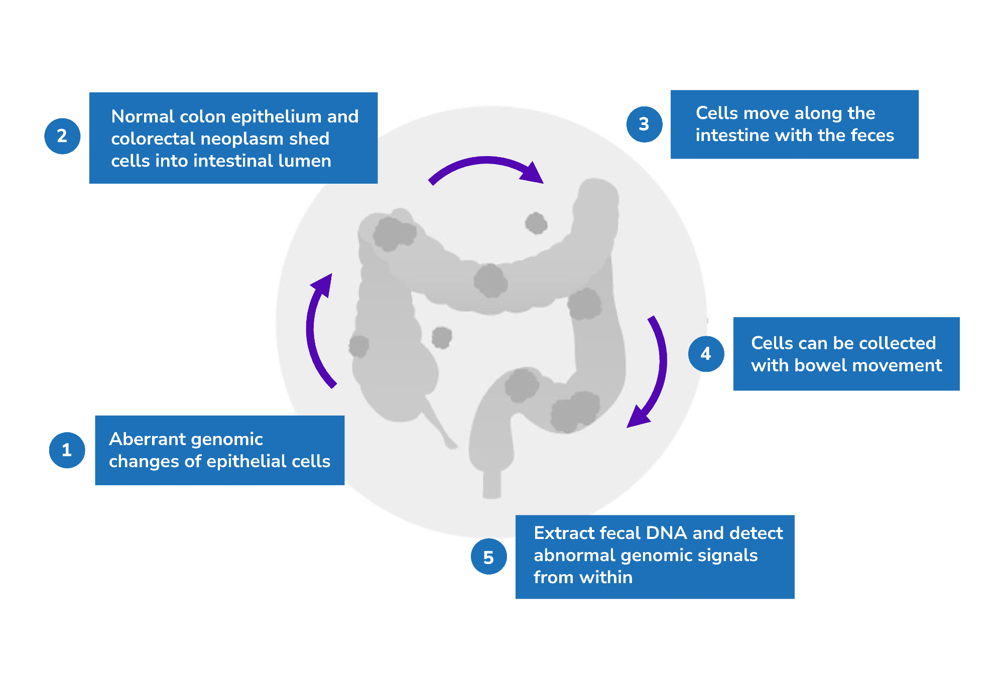The principle behind this test is that both normal colon epithelium and colorectal neoplasms shed cells into the intestinal lumen through normal cell turnover and apoptosis. These cells will move along the intestine with feces and can be collected with bowel movement. Fecal DNA can then be extracted to detect abnormal genomic signals.