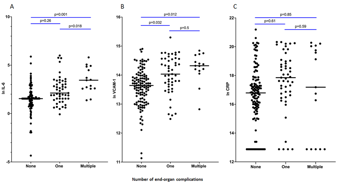 In contrast to IL-6 and VCAM-1, the researchers did not observe any differences in plasma CRP concentrations with end-organ complications. Other studies have shown conflicting results, possibly due to their focus on severe hypertension and other multiple symptoms as indicators of severity, rather than specific end-organ complications.