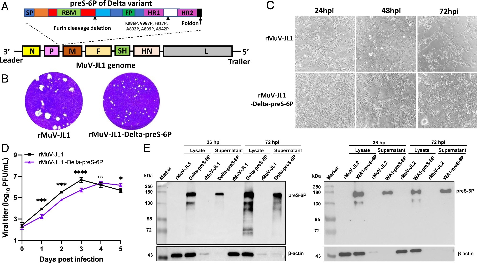 Recovery and characterization of rMuV-JL1-Delta-preS-6P expressing the six proline-stabilized prefusion spike of SARS-CoV-2 Delta variant. (A) Strategy for insertion of preS-6P of the Delta variant into the P and M gene junction in the MuV-JL1 genome. (B) The plaque morphology of rMuV-JL1 and rMuV-JL1-Delta-preS-6P in Vero CCL81 cells at day 5. (C) rMuV-JL1-Delta-preS-6P exhibits delayed syncytia formation in Vero CCL81 cells (MOI of 0.1). (D) Replication kinetics of recombinant viruses in Vero CCL81 cells at an MOI of 0.1. (E) Expression of preS-6P in rMuV-JL1-Delta-preS-6P (Left) or rMuV-JL2-WA1-preS-6P (Right)-infected Vero CCL81 cells. An MOI of 0.1 was used for infection, and 10 μL of cell lysate (from total 200 μL) and 10 μL (from total 1 mL) of supernatant were used for Western blot.