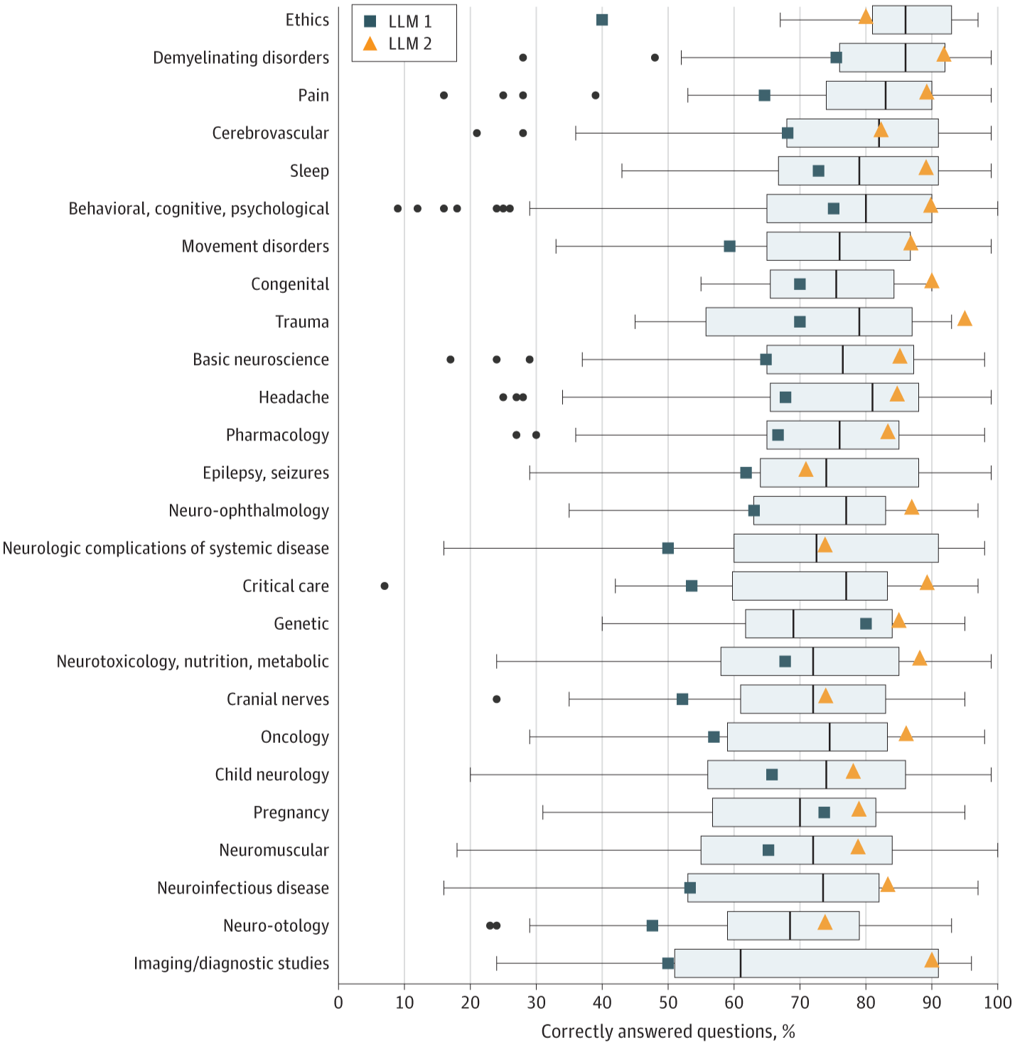 "In the behavioral, cognitive, psychological category, LLM 2 outperformed both LLM 1 and average test bank users (LLM 2: 433 of 482 [89.8%]; LLM 2: 362 of 482 [75.1%]; human users: 76.0%; P < .001). LLM 2 also exhibited superior performance in topics such as basic neuroscience, movement disorders, neurotoxicology, nutrition, metabolic, oncology, and pain compared with LLM 1, whereas its performance aligned with the human user average"