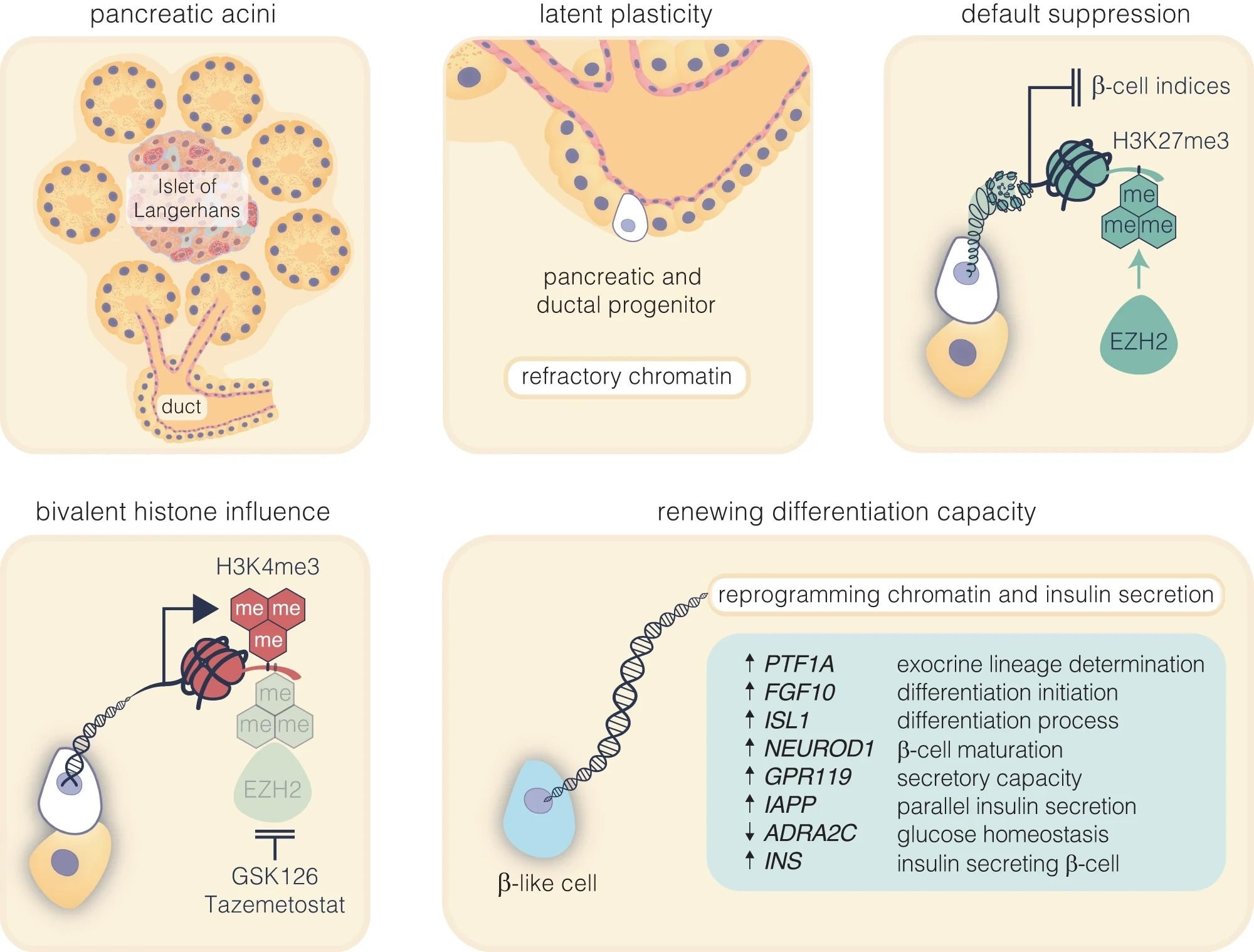 The existence of pancreatic ductal progenitors for β-cell generation is debated in the field, with conflicting results from observational studies, pancreatic injury models, and lineage tracing experiments. However, recent studies suggest the potential for pancreatic ductal progenitors to differentiate into adult β-cells. Additionally, evidence from a case report suggests that GSK126 (an FDA-approved EZH2 inhibitor) could partially restore insulin function by enabling the conversion of exocrine cells from a T1D donor into β-like cells. Expanding these findings, researchers in the present study characterized the potential of GSK126 and Taz (another EZH2 inhibitor) to restore key β-cell-like function in isolated exocrine cells.
