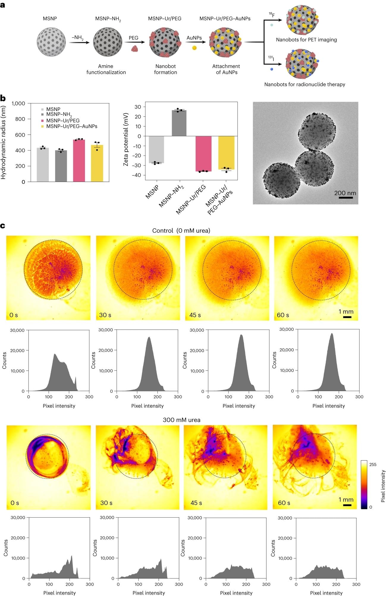 a, Schematic representation of the nanobot fabrication process and radiolabelling. Ur, urease. b, Left: nanobot characterization by dynamic light scattering (n = 3, technical replicates). Data are presented as mean values and error bars represent the s.e.m. Centre: zeta potential (n = 3, technical replicates) Data are presented as mean values and error bars represent the s.e.m. Right: transmission electron microscopy image. c, Snapshots depicting the nanobot motion dynamics in the absence and presence (300 mM) of urea as fuel, and corresponding pixel intensity histograms for the ROI marked by a circle. Panel a created with BioRender.com.